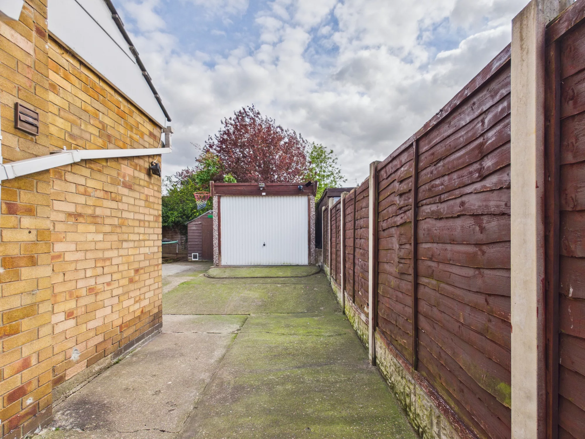 The property has a driveway, providing ample off-road parking for several vehicles and leading to a single detached garage, ideal for secure parking, additional storage, or potential workshop use. The frontage is enhanced by a well-kept front garden, adding to the home’s kerb appeal and creating a welcoming first impression.
