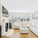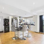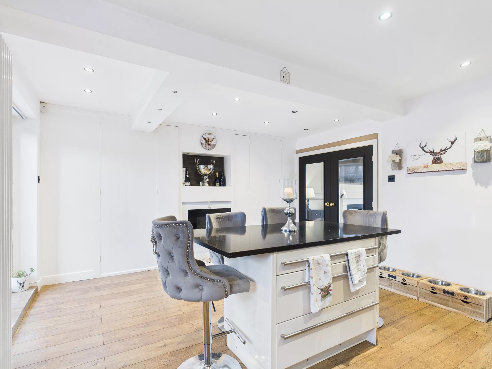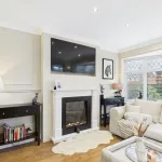 The dining area flows effortlessly to the outdoors through patio doors, and features an electric fireplace and built-in storage cupboards, creating a warm and practical entertaining space. A downstairs WC adds further convenience.