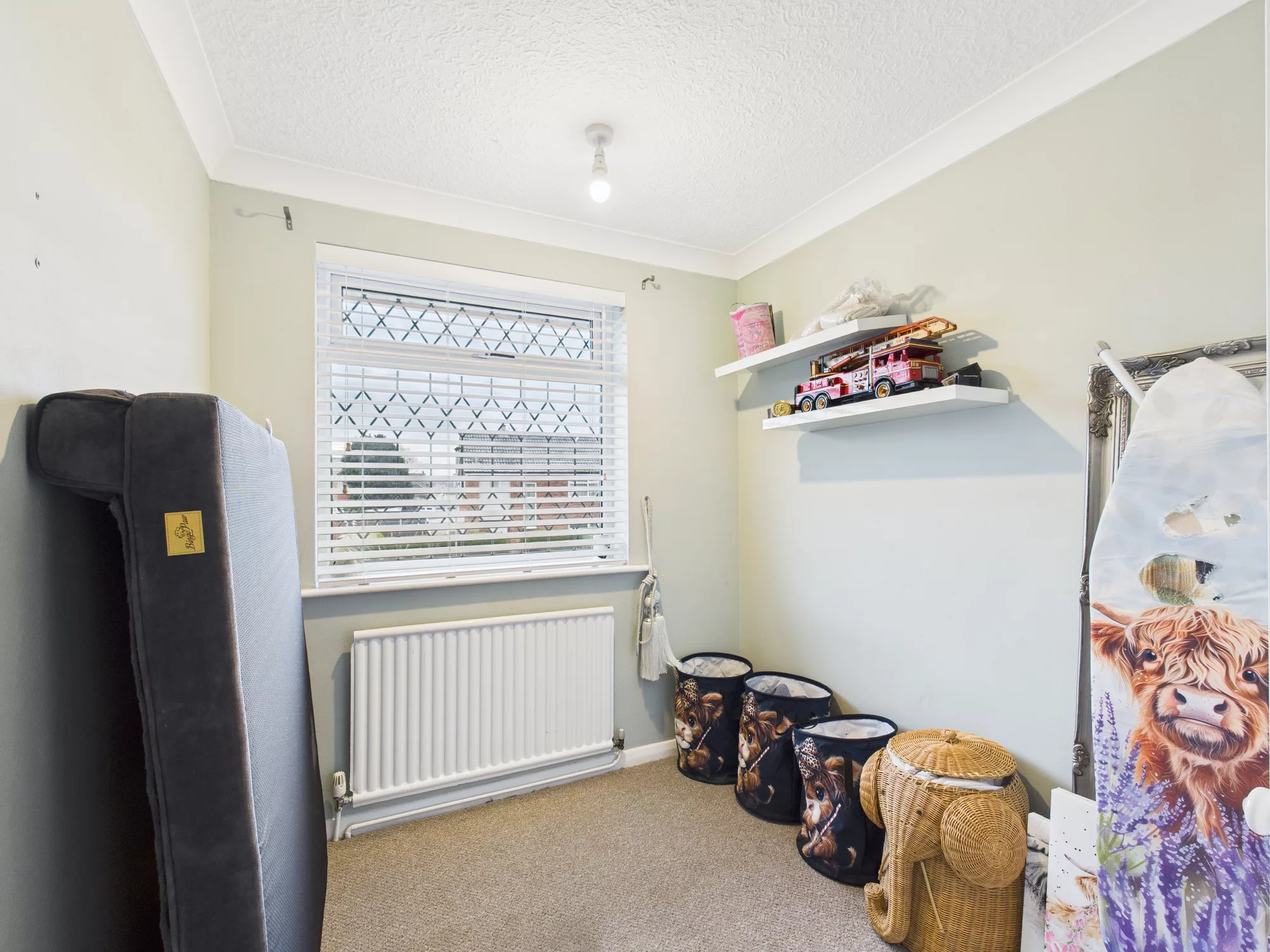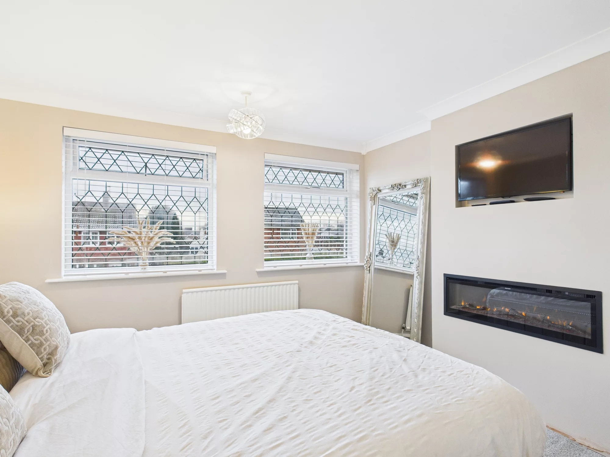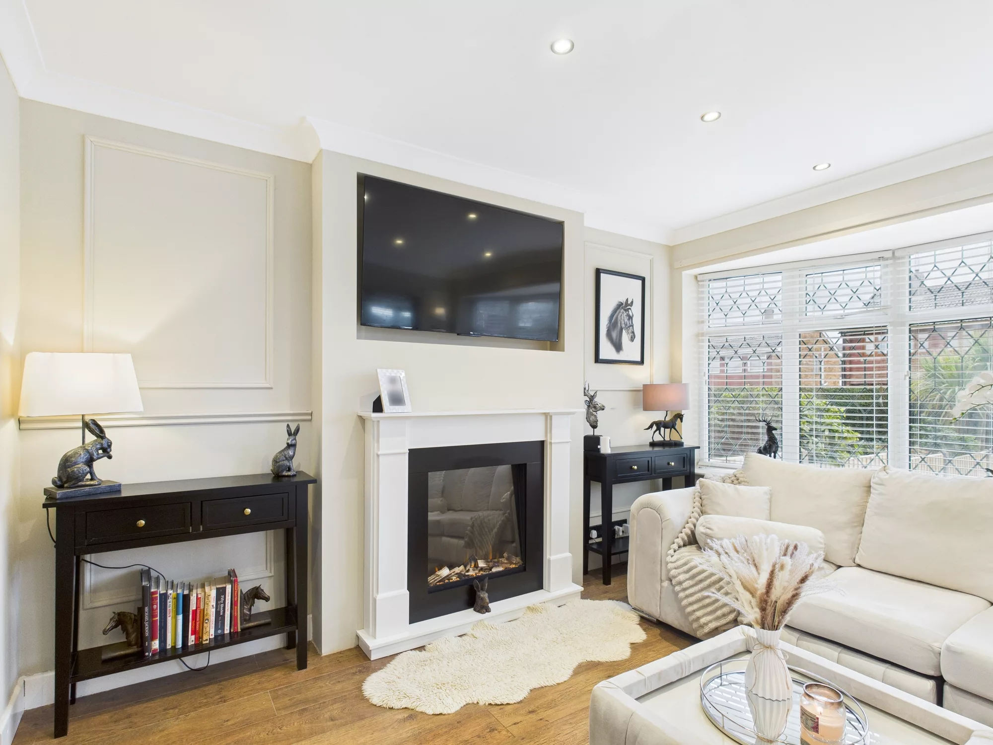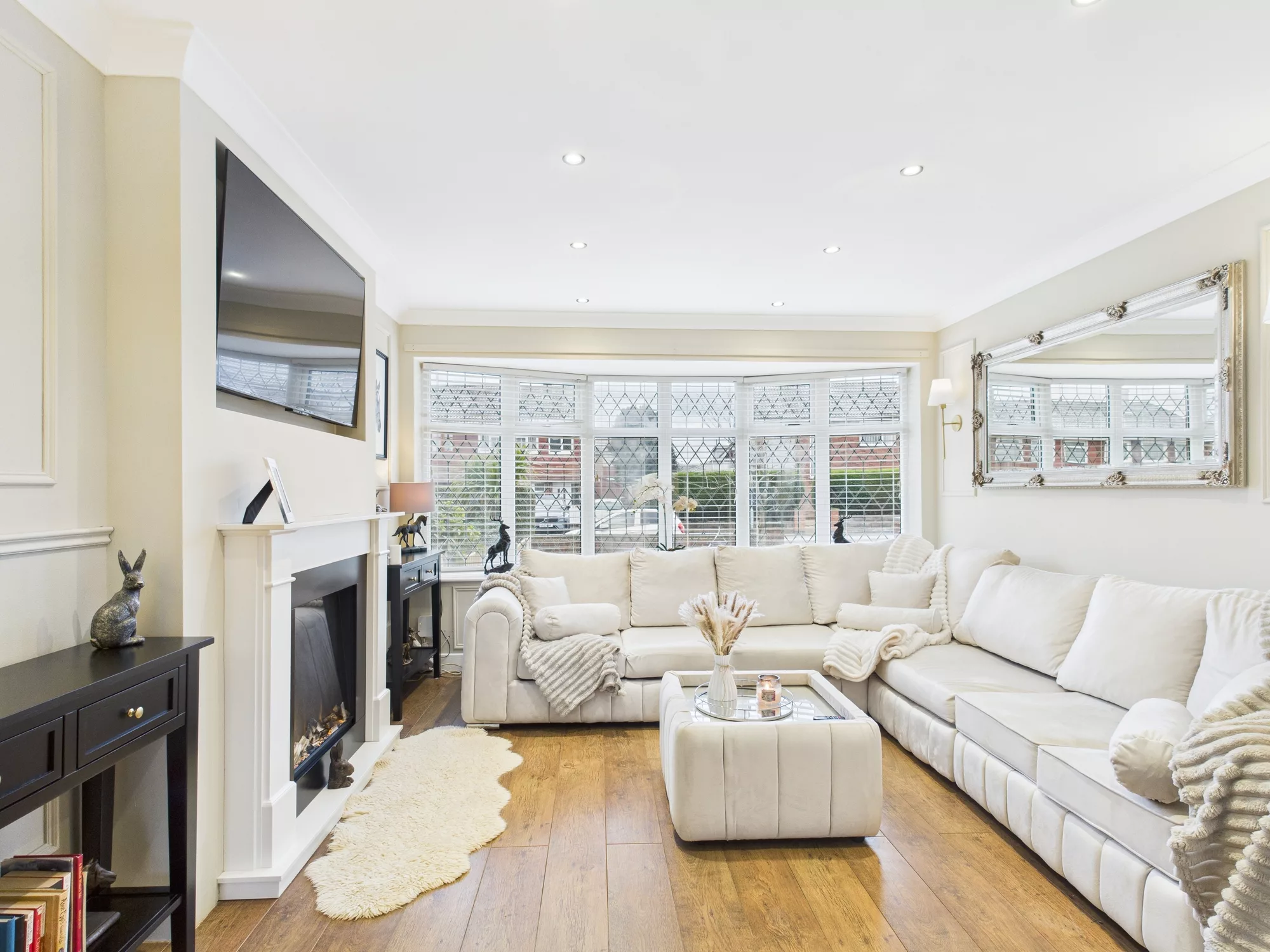 To the front of the home, the spacious lounge boasts a charming bay window and a stylish feature fireplace with electric fire, offering a cosy retreat.