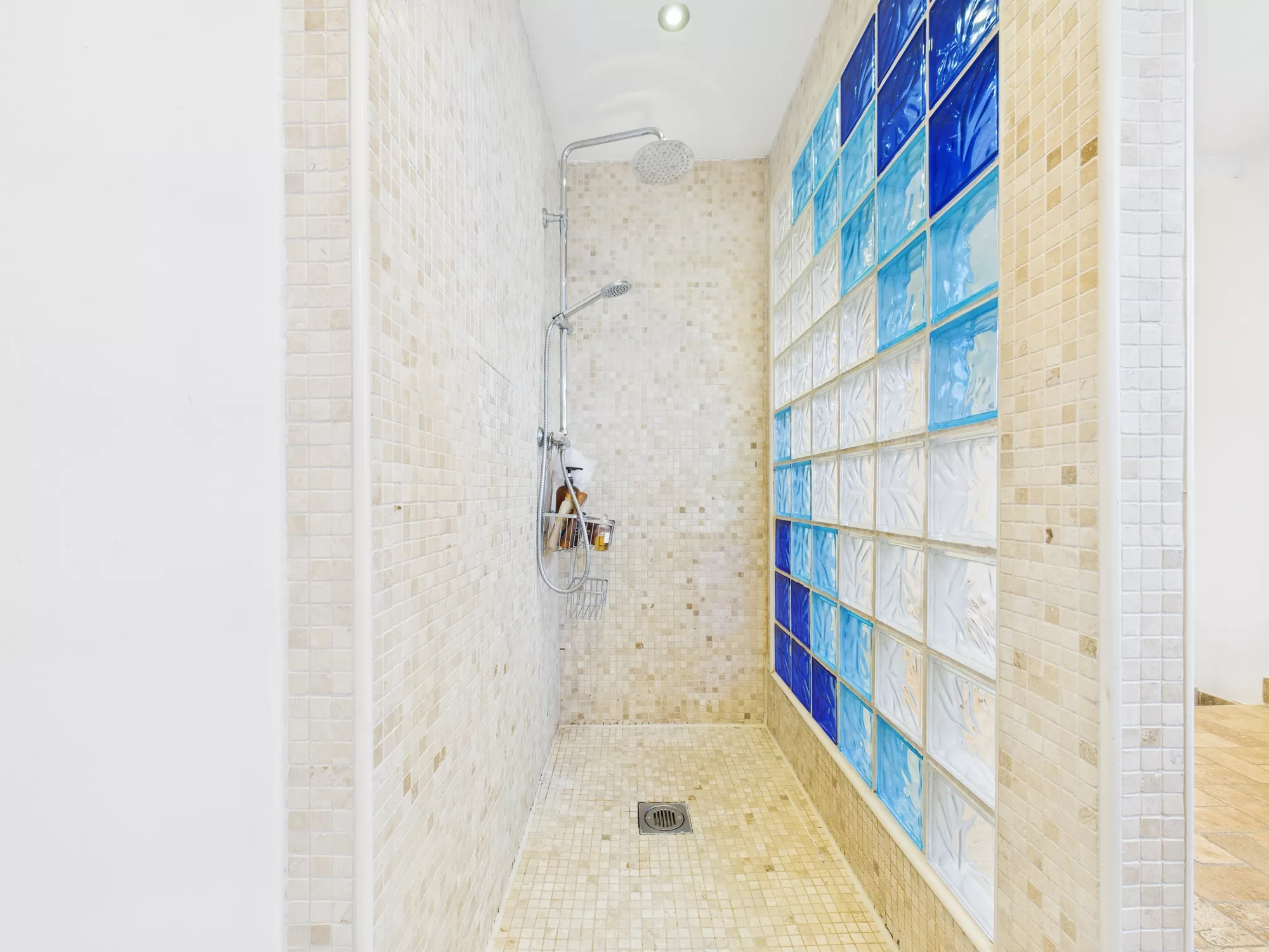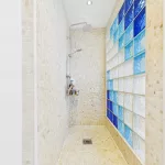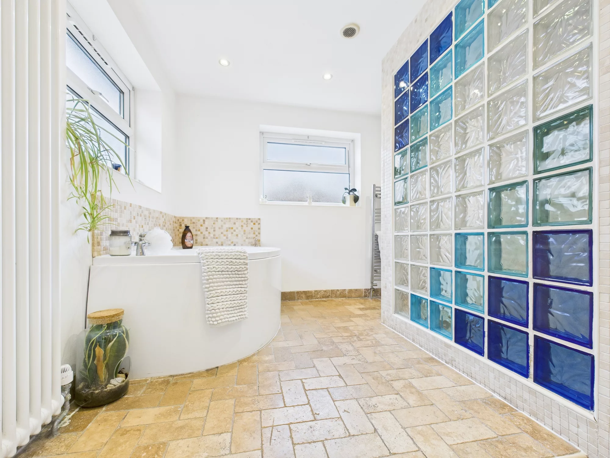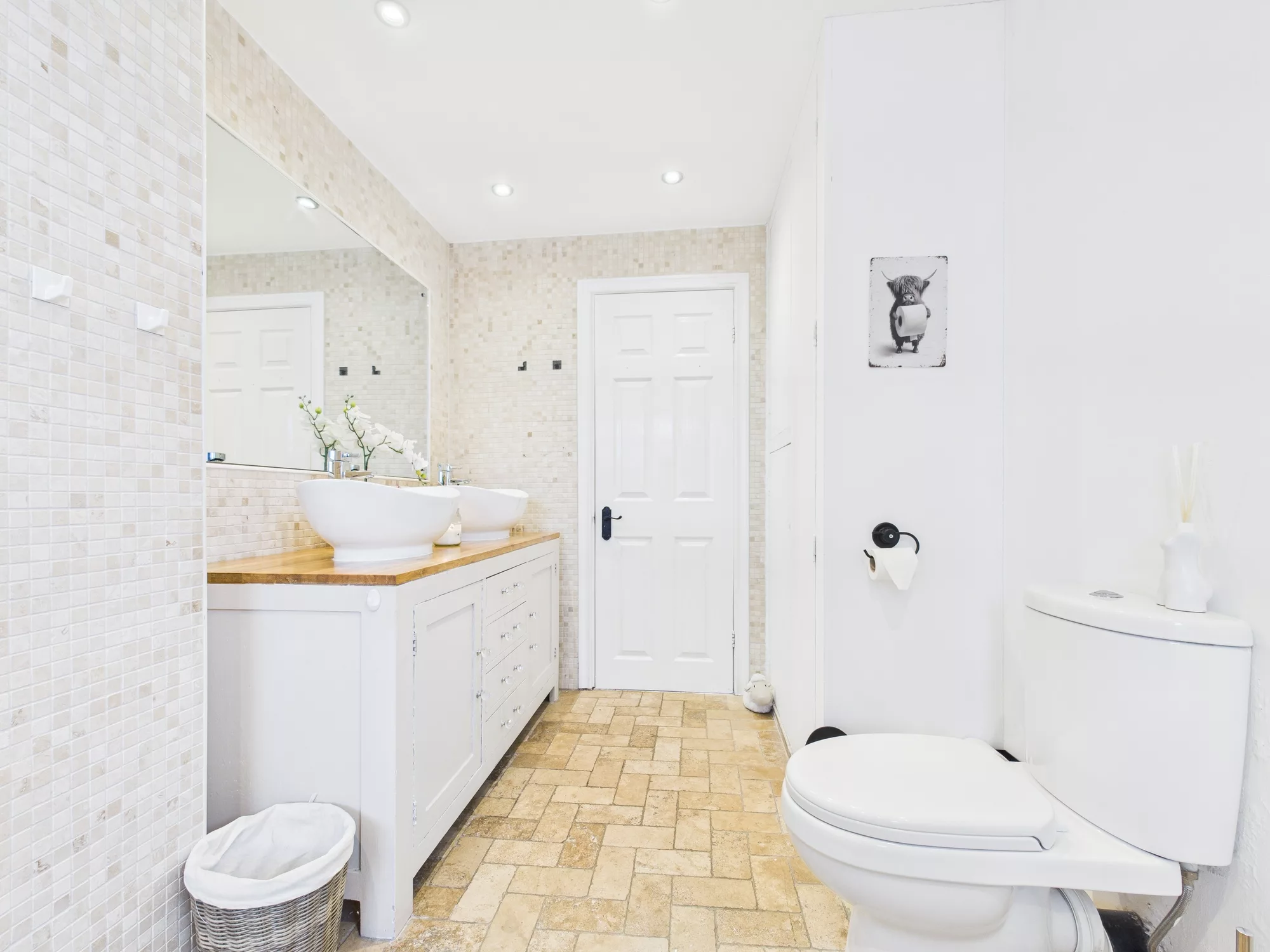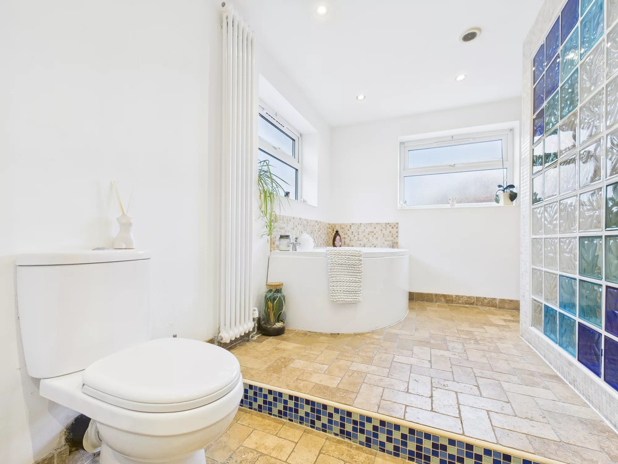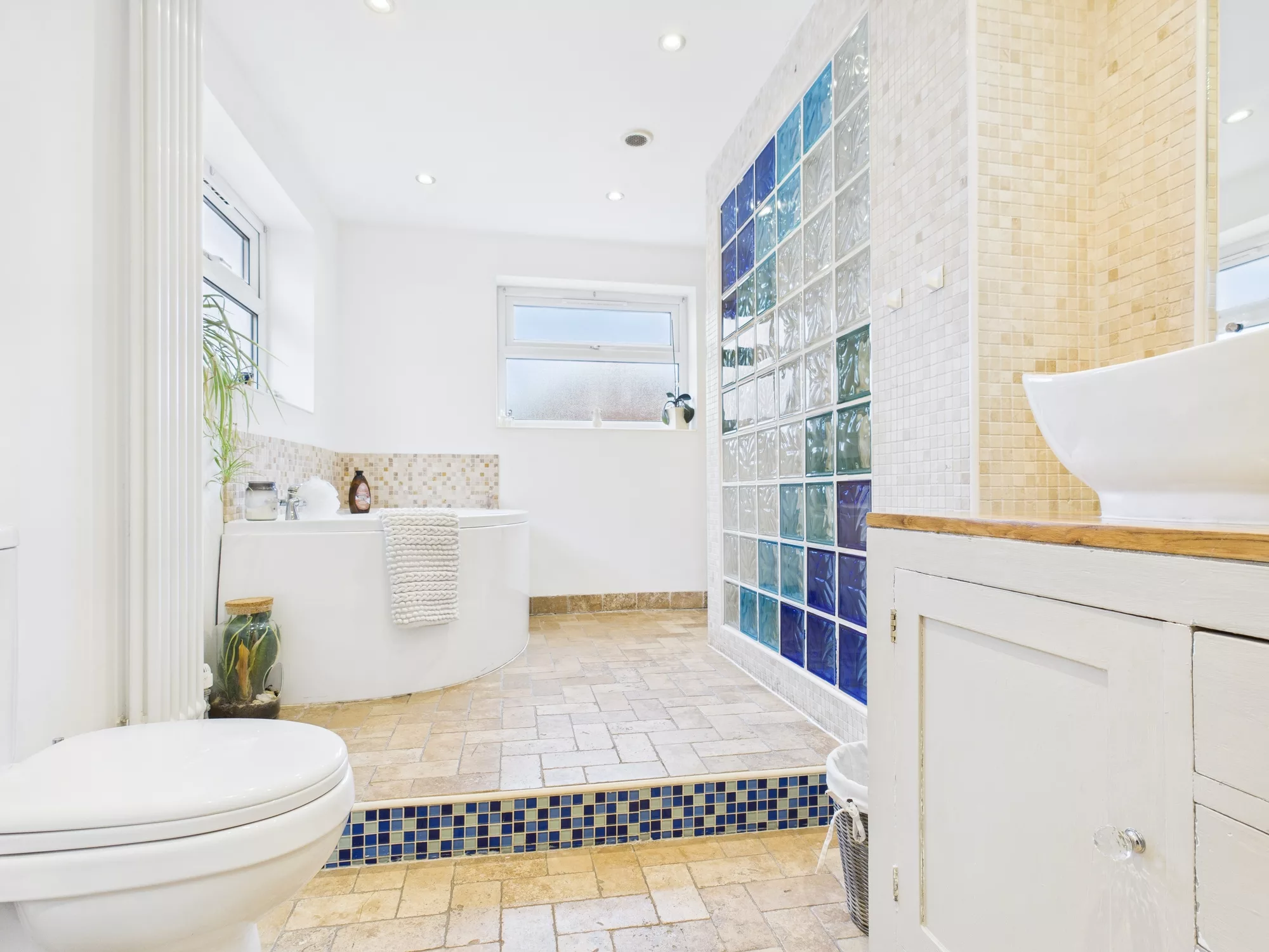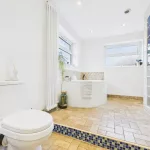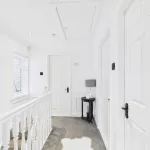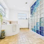 Upstairs, the landing leads to three well-proportioned bedrooms—two generous doubles and a comfortable single with a built-in cupboard. The family bathroom is a true highlight: spacious and beautifully appointed with a WC, double sink with storage unit, a raised corner bath, and a separate open shower with elegant partitioning.