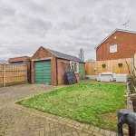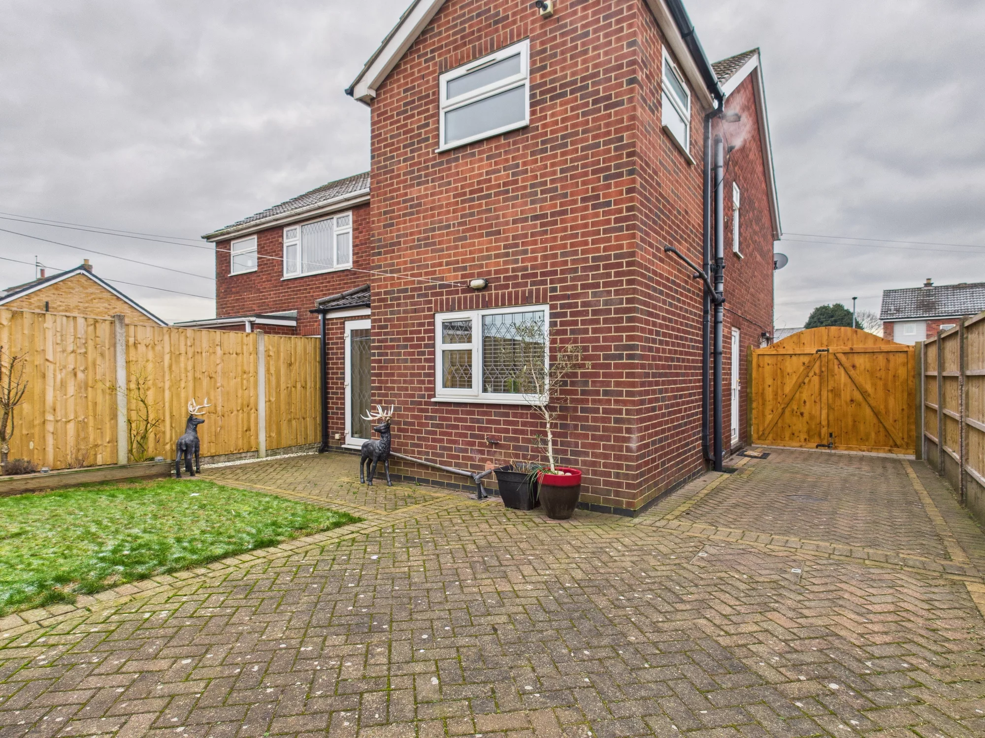 Outside, the property continues to impress. The block-paved driveway to the front provides parking for multiple vehicles with a corner lawn, bordered by brick walls and fencing. A tall wooden double gate leads through to the rear garden, where there is additional parking, a single garage, and a wonderfully private outdoor space. The garden features a central lawn, block-paved patio areas, raised flowerbeds, and secure boundary fencing—perfect for relaxing or entertaining.