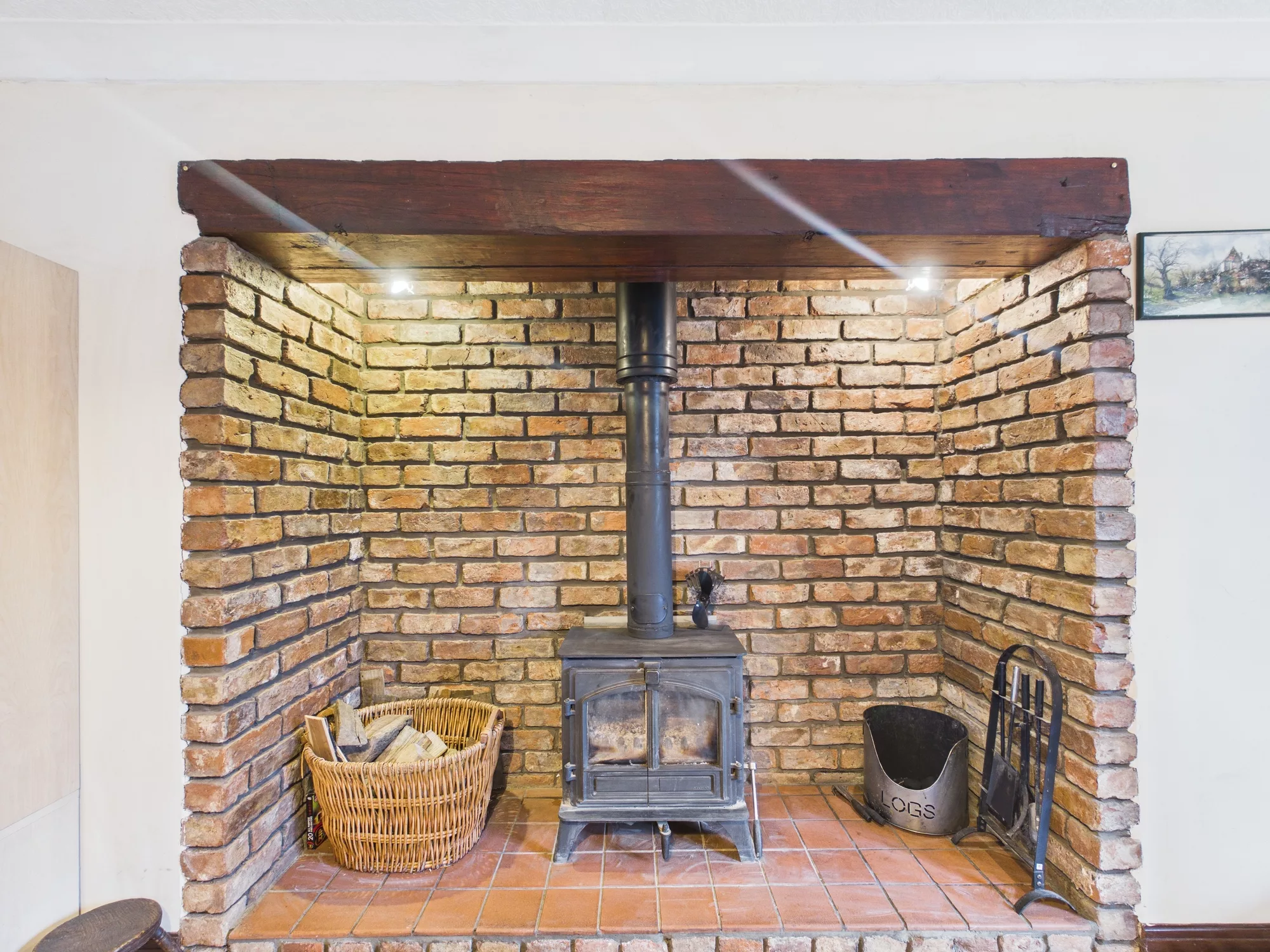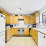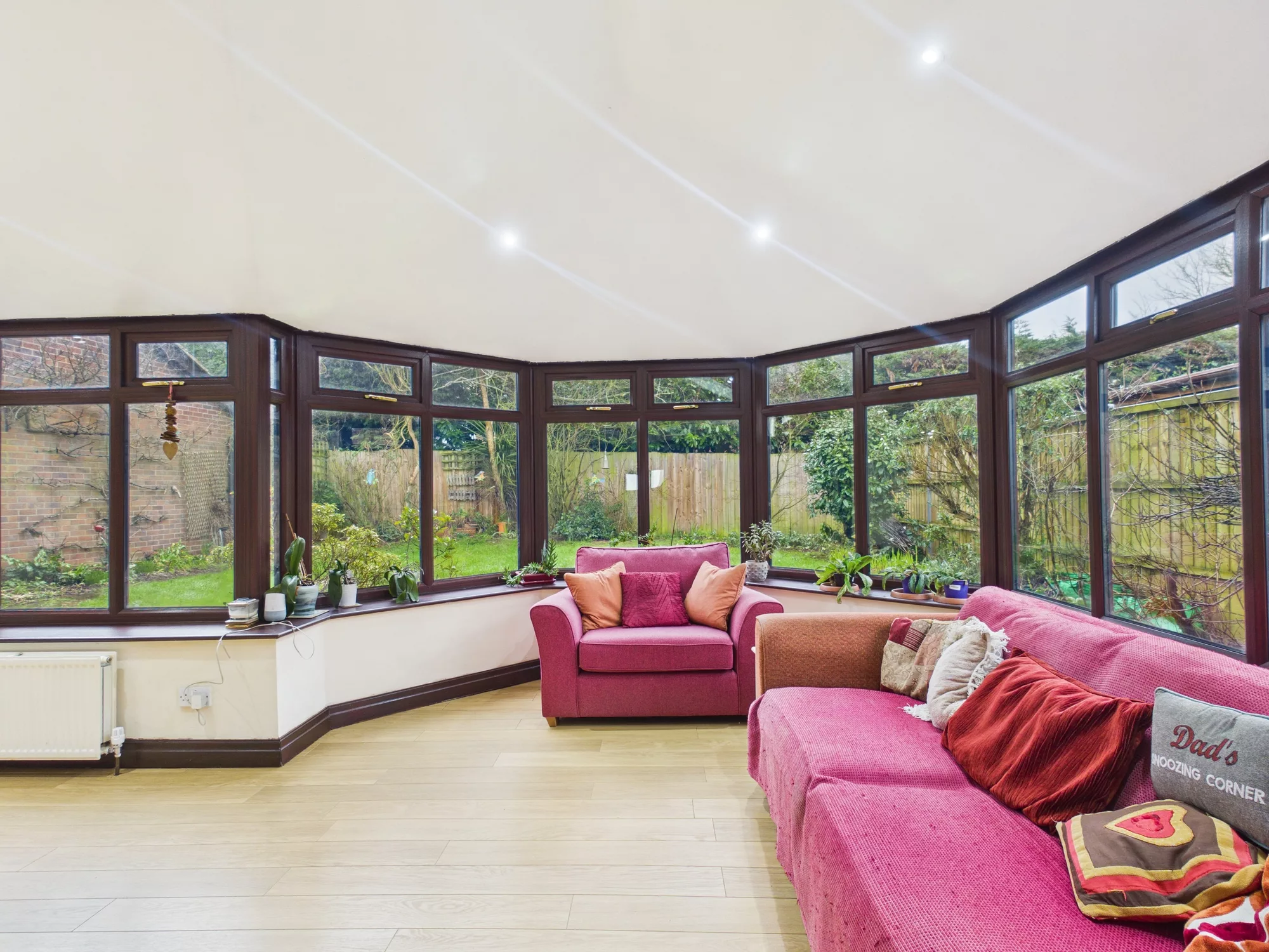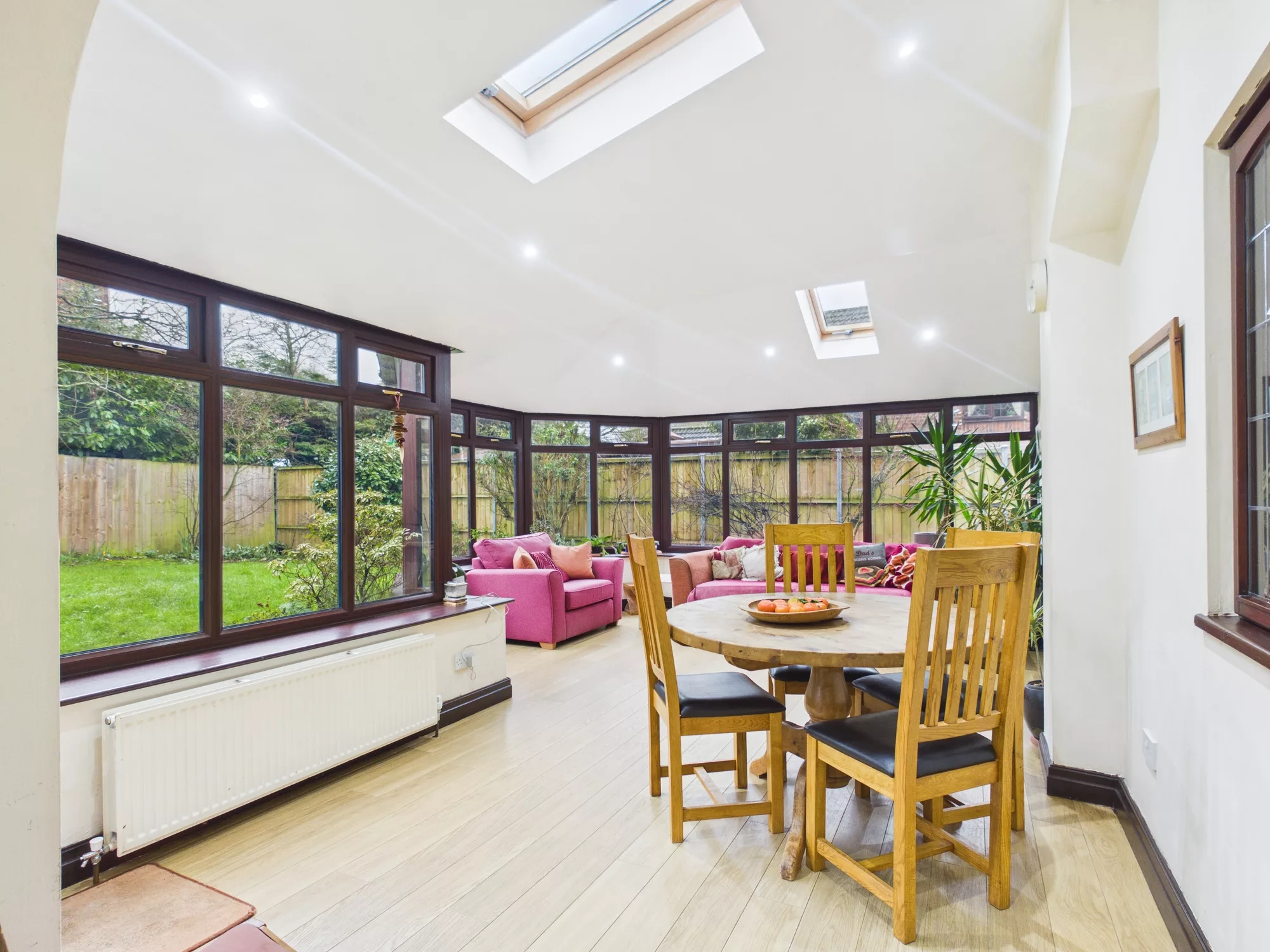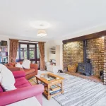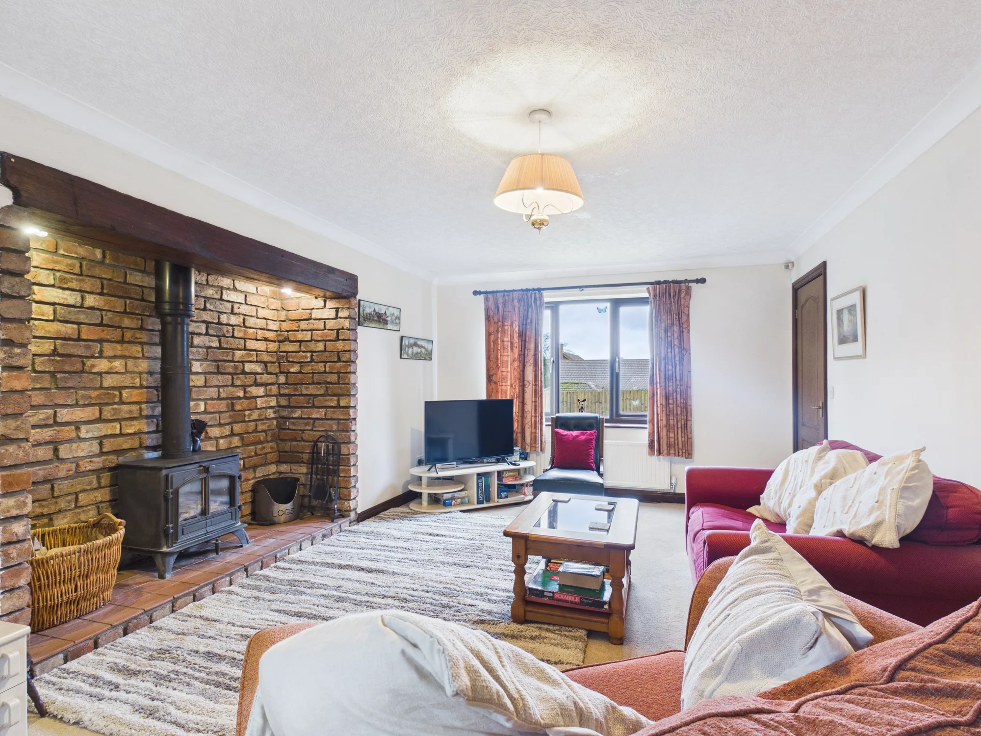 The well-equipped kitchen is perfectly designed for family life, featuring an integrated oven, electric hob and extractor hood, along with ample undercounter and freestanding space for appliances. An open archway leads seamlessly into the bright and airy conservatory, currently arranged as a dining and lounge area, offering a wonderful setting for entertaining or simply relaxing while overlooking the garden. Double doors connect through to the spacious main lounge, where a beautiful brick fireplace houses a charming log burner, creating a cosy and inviting focal point.