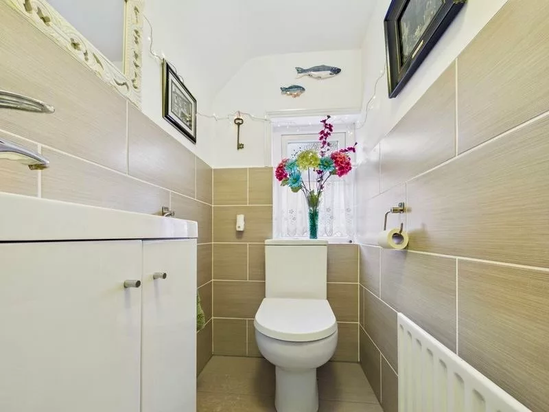 This charming downstairs toilet is a practical and well-considered addition, ideal for guests and everyday convenience. Cleverly positioned beneath the stairs, it makes excellent use of space while maintaining a cosy and cohesive feel in keeping with the rest of the home. The room features a WC, wash basin, radiator, and a window that allows for natural light and ventilation, creating a bright and welcoming atmosphere.