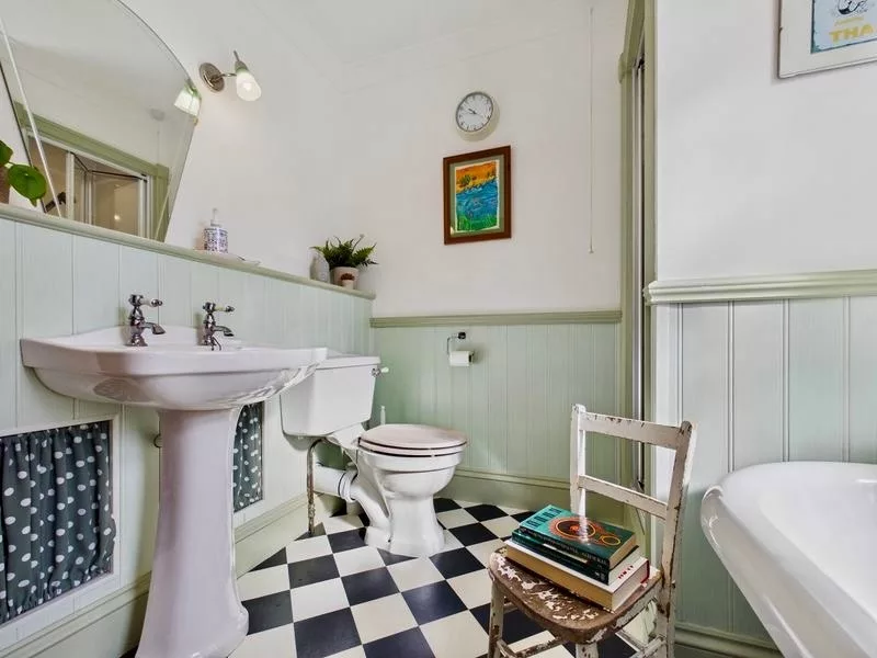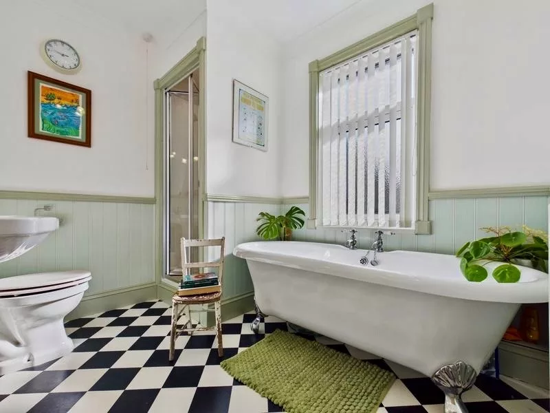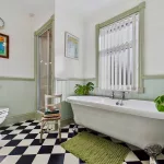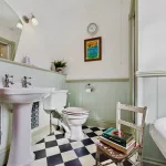 This beautifully appointed main bathroom embraces a charming country-style aesthetic, enhanced by carefully considered traditional touches throughout. It features a freestanding bath, separate shower, WC, and wash basin, set against striking retro-inspired tiling and tasteful half-height wall panelling that adds warmth and character. A window allows for natural light and ventilation, creating a bright and refreshing atmosphere. Cleverly integrated storage, including discreet cubbies either side of the sink for hidden space, ensures the room remains both practical and elegantly uncluttered.