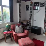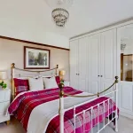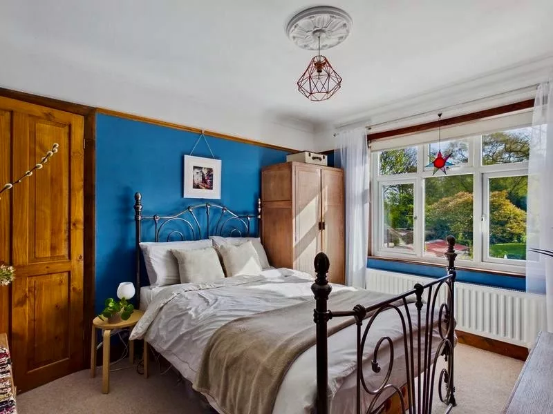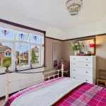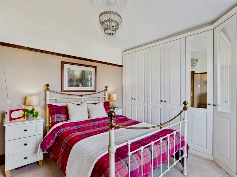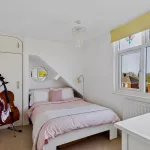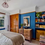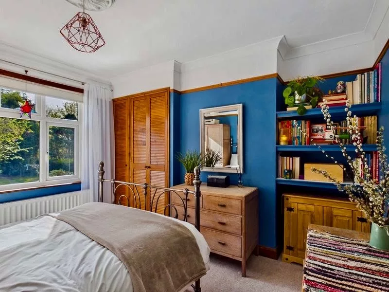 This attractive bedroom enjoys a lovely outlook over the extensive garden, with a large window drawing in plenty of natural light. Offering a comfortable and versatile layout, the room includes an integrated wardrobe and a built-in bookshelf, adding both convenience and charm. There is also generous floor space to accommodate additional furniture such as wardrobes or dressers, making it a practical yet inviting space suited to a variety of needs.
