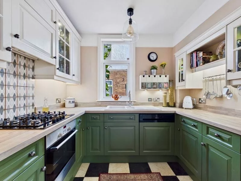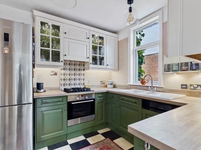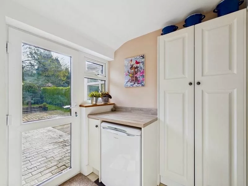 This delightful open-plan kitchen is full of character, featuring characterful touches such as, the beautifully restored original cupboards that have been thoughtfully updated with a fresh coat of paint. A colourful backsplash adds vibrancy, perfectly complementing the stunning retro-style tiled flooring. Designed with both style and practicality in mind, the space offers ample storage and room for a fridge freezer. With convenient access to the utility room, this charming kitchen effortlessly blends period charm with everyday functionality.