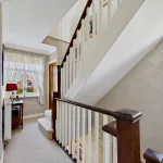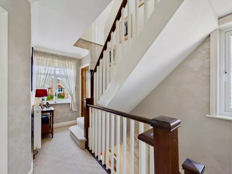 This neatly presented first-floor landing serves as a central access point to both the ground and second floors, combining practicality with a warm, inviting feel. A window allows natural light to brighten the space, enhancing the cosy atmosphere created by soft carpeting underfoot. The country-style banister adds charm and character, in keeping with the rest of the home, while useful storage space ensures the area remains tidy and well-organised.