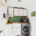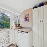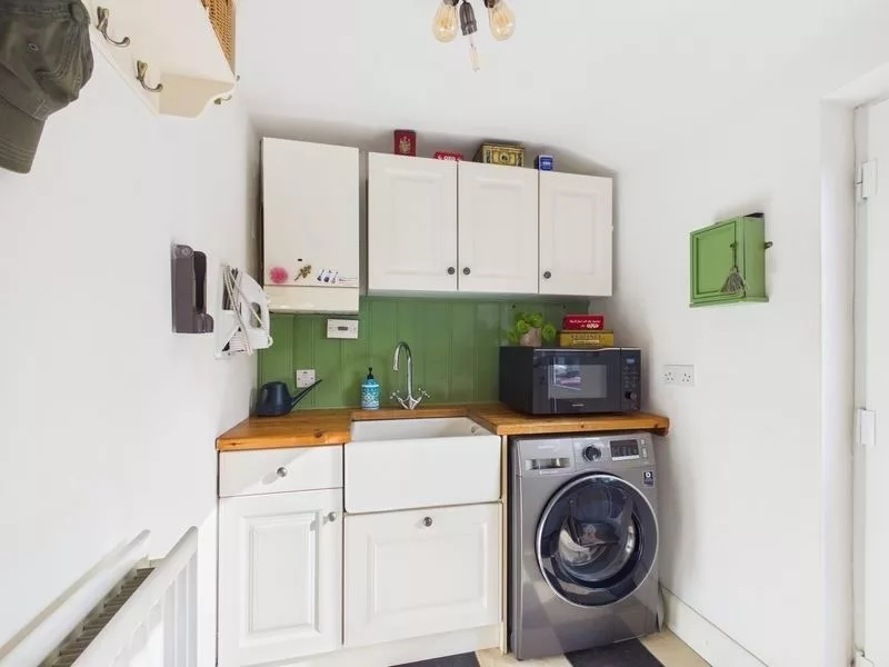This well-appointed utility room combines practicality with style, offering direct access to the outdoors for added convenience. Designed to keep the main living areas clutter-free, it provides ample space for a washer and dryer, along with plentiful storage solutions. A charming area for hanging coats enhances everyday organisation, while cleverly concealed spaces allow for appliances such as a microwave to be tucked neatly away. Complete with an attractive sink, this is a highly functional yet thoughtfully designed addition to the home.