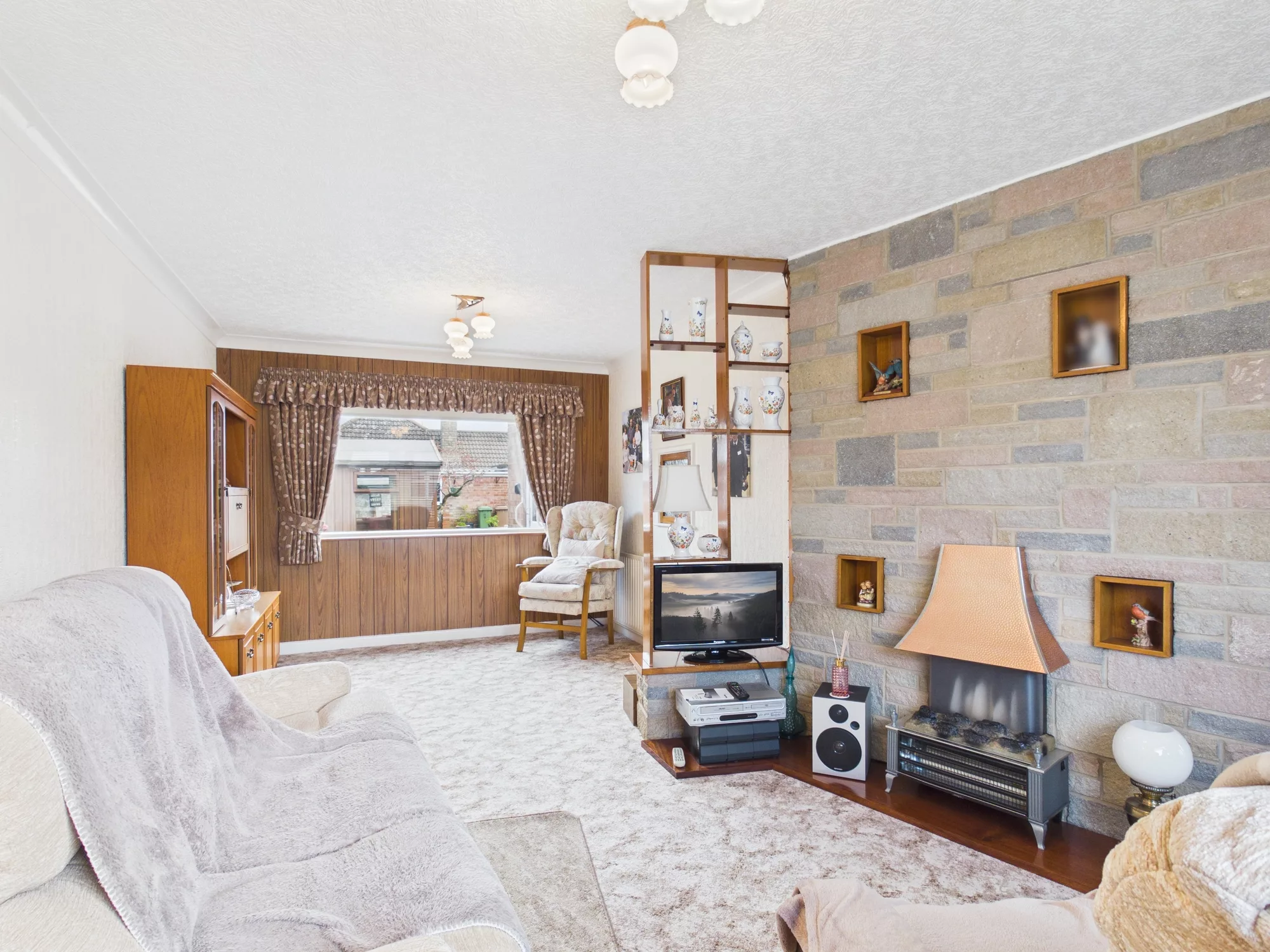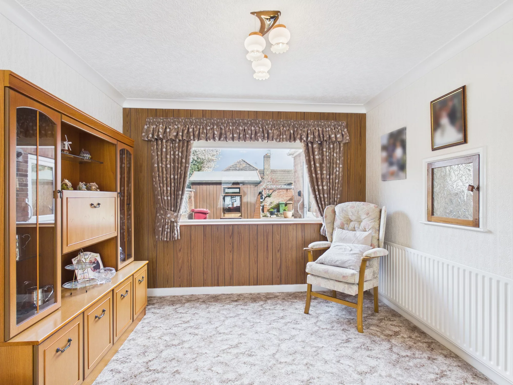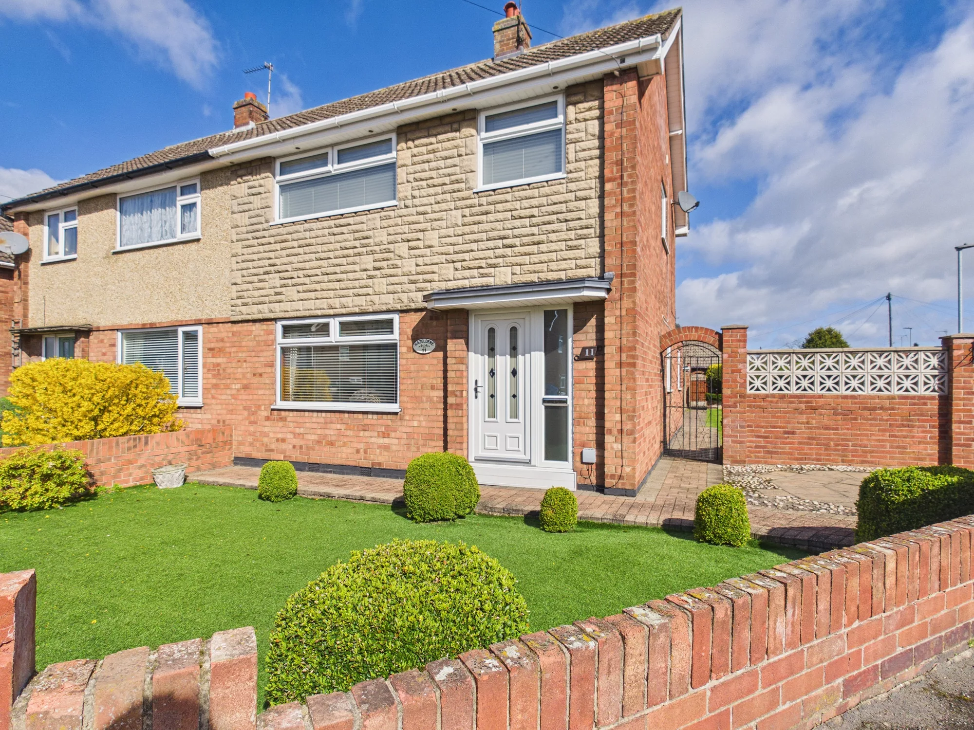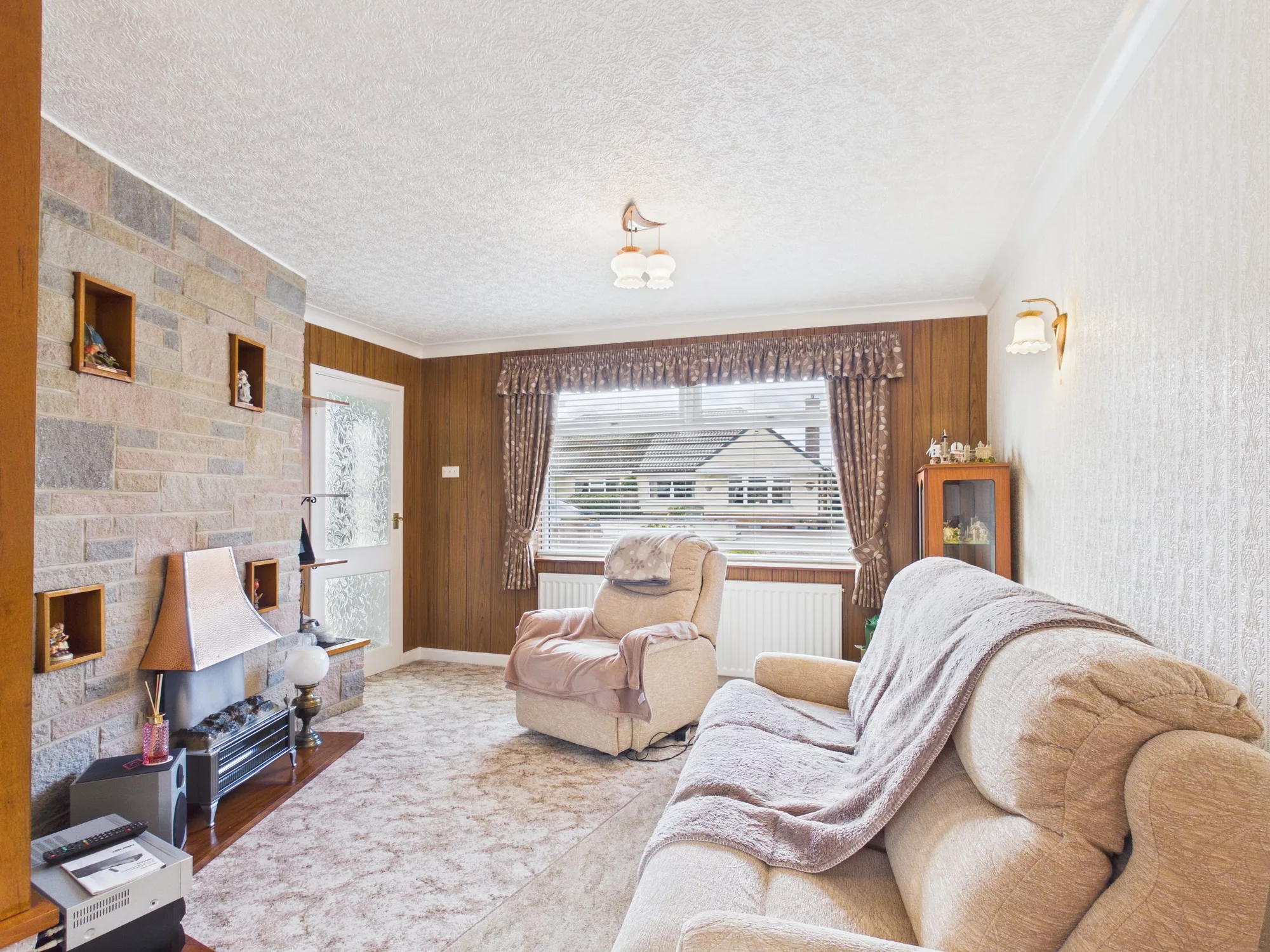 The home boasts a beautifully presented, low-maintenance front garden enclosed by an attractive brick wall, with gated access adding both charm and privacy. Step inside to a welcoming entrance hall, open to the staircase, leading through to a spacious and uniquely styled lounge. This inviting living space features a characterful layout, a charming feature fireplace, and an eye-catching internal window that connects through to the dining area—creating a wonderful sense of flow.