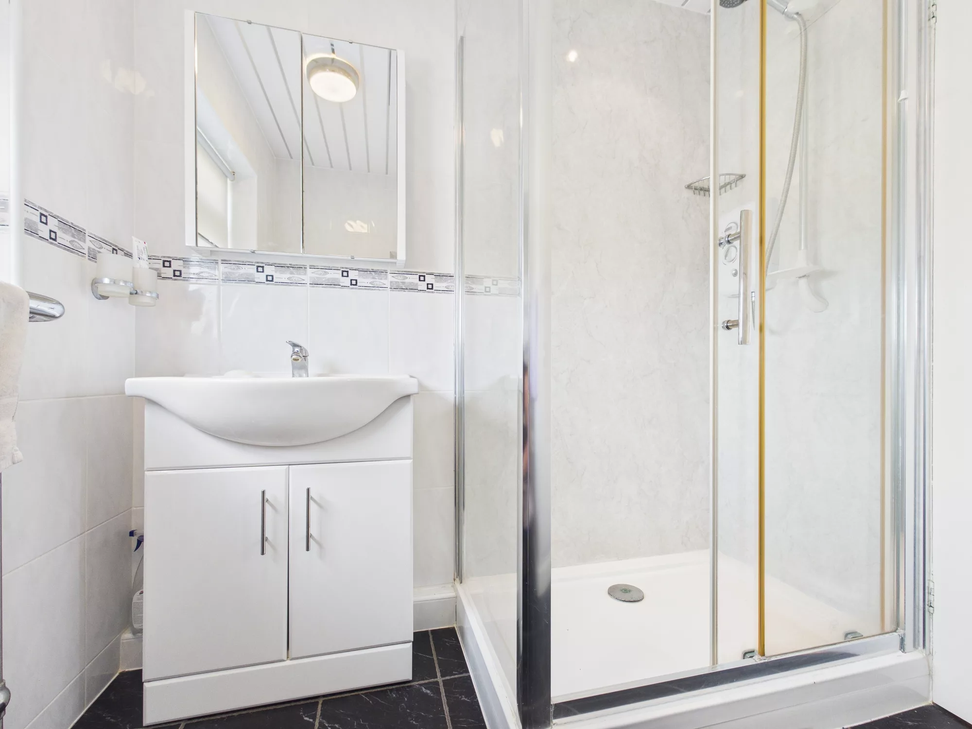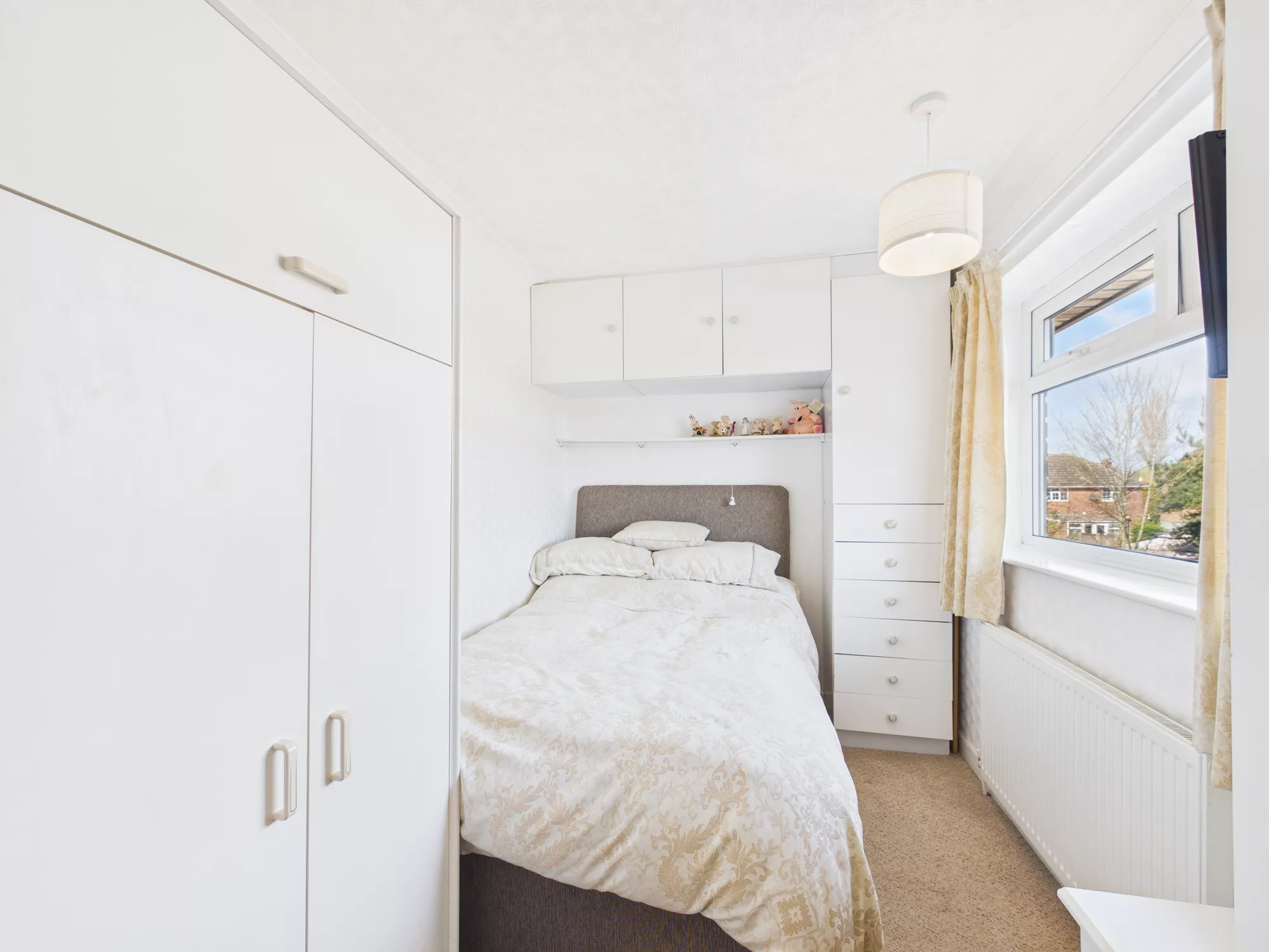 Upstairs, the landing leads to three bedrooms and a modern family shower room. Two generous double bedrooms benefit from built-in wardrobes and storage, while the third is a cosy single room with its own built-in cupboard—ideal as a nursery, home office, or guest room.