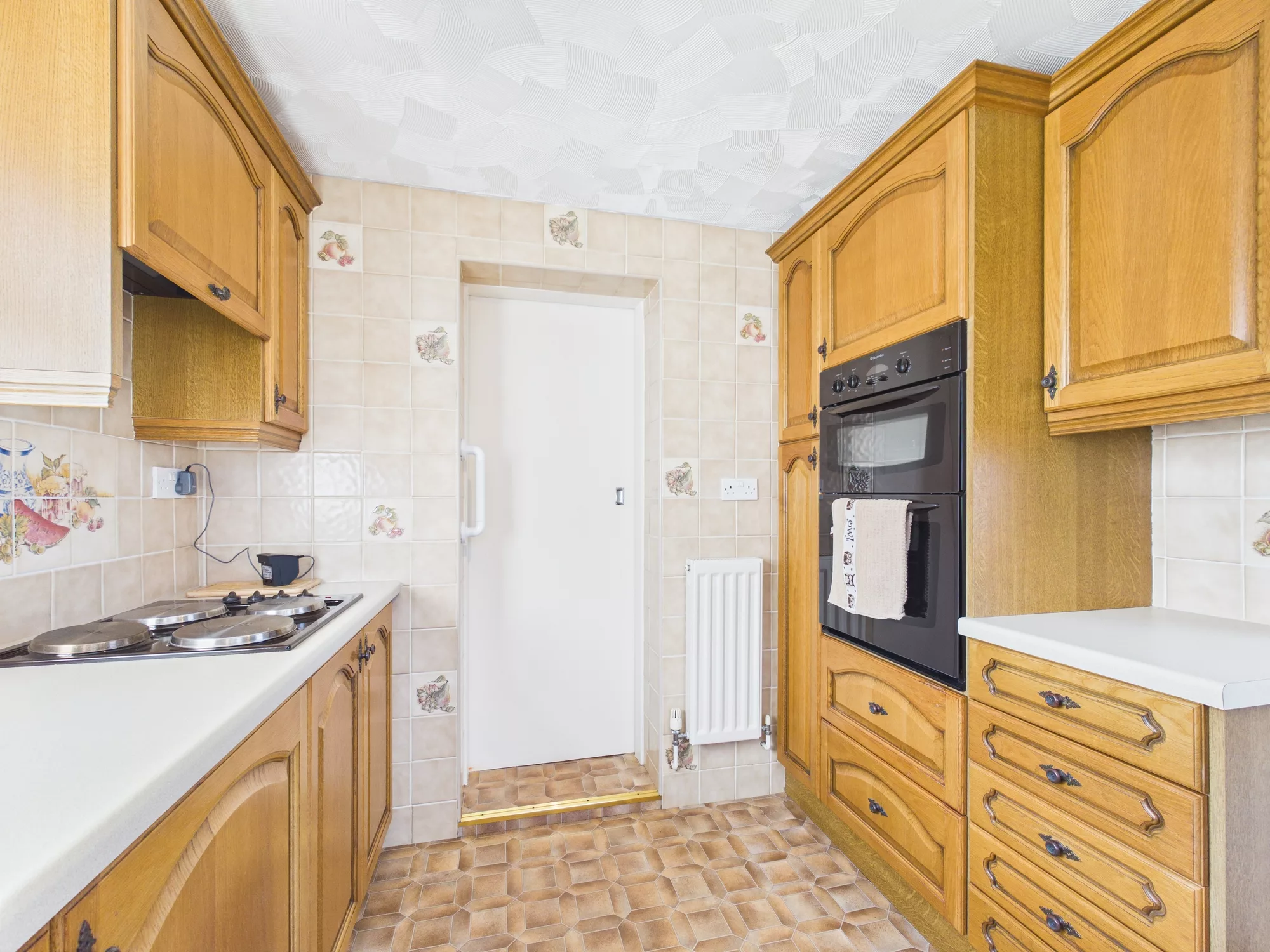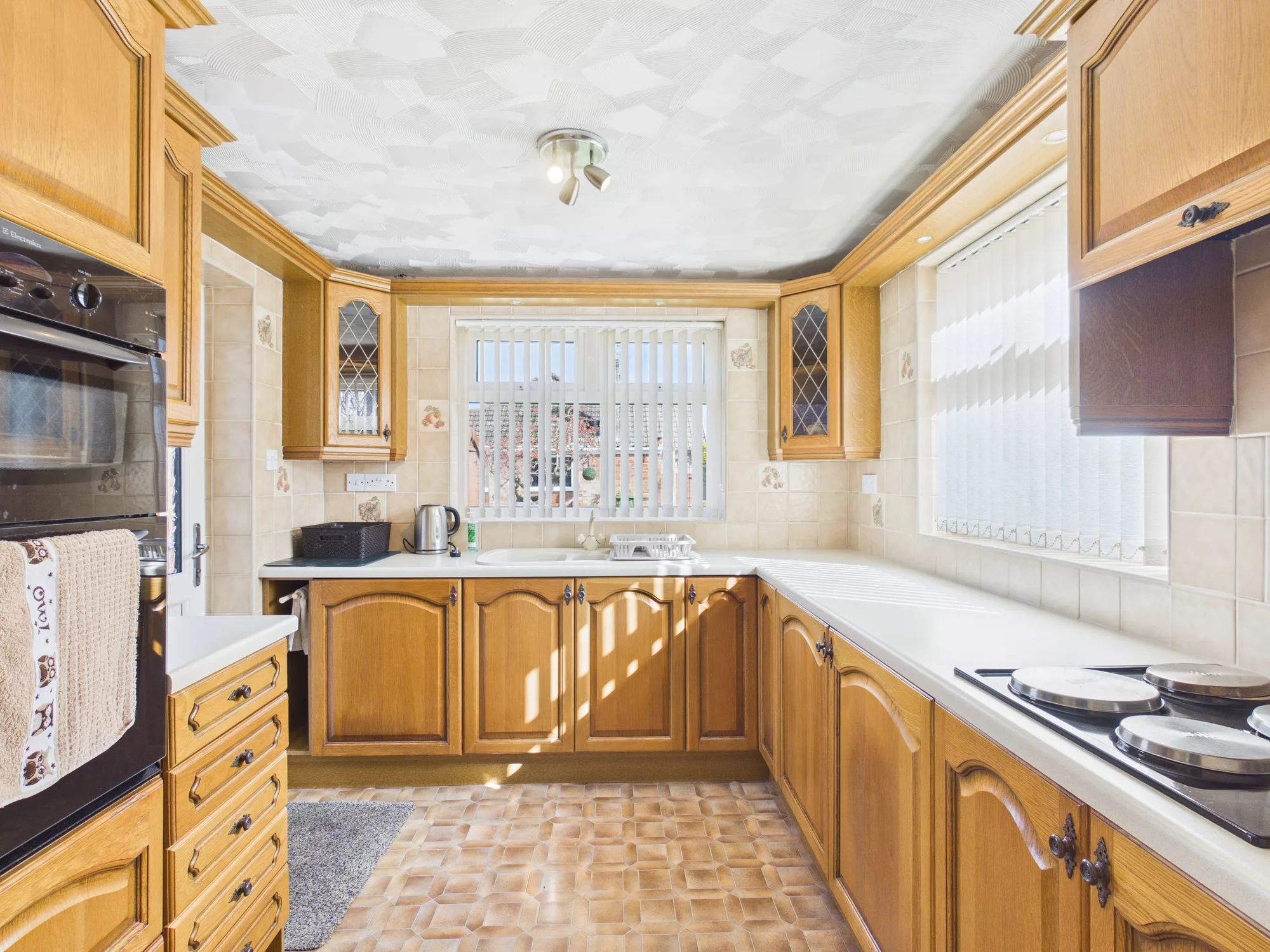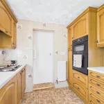 The dining area opens seamlessly into a well-equipped kitchen, fitted with an abundance of wooden wall and base units and complete with integrated appliances including an oven, hob, extractor hood, washing machine, fridge, and freezer—making it both practical and stylish.