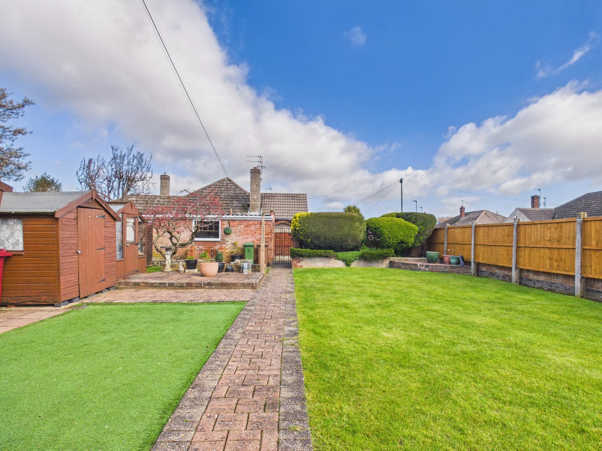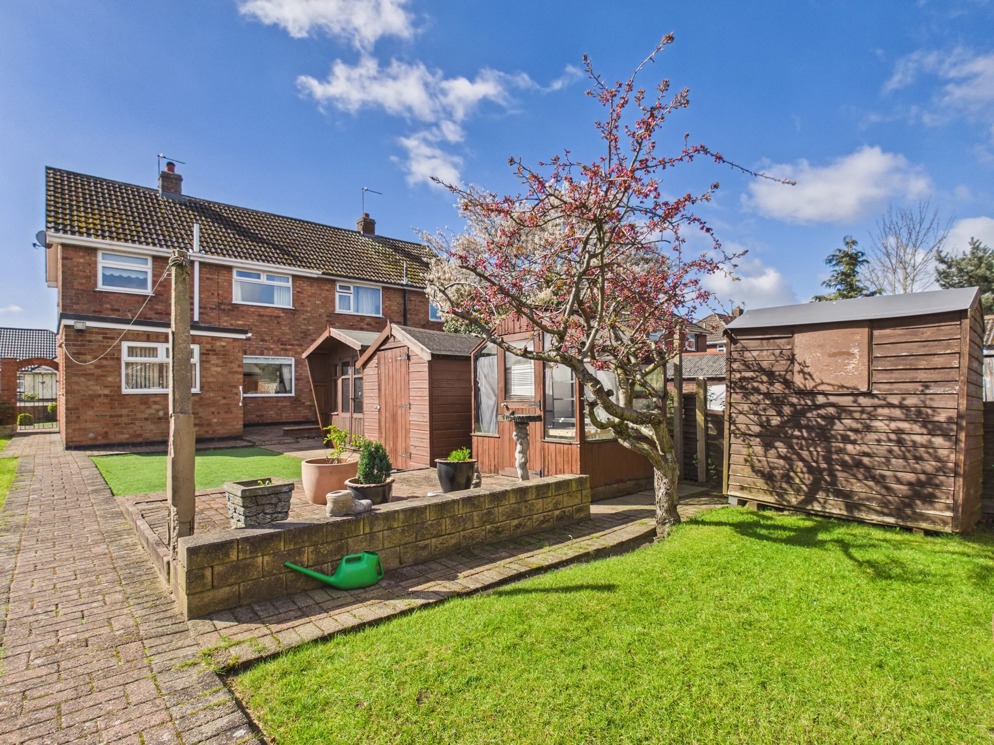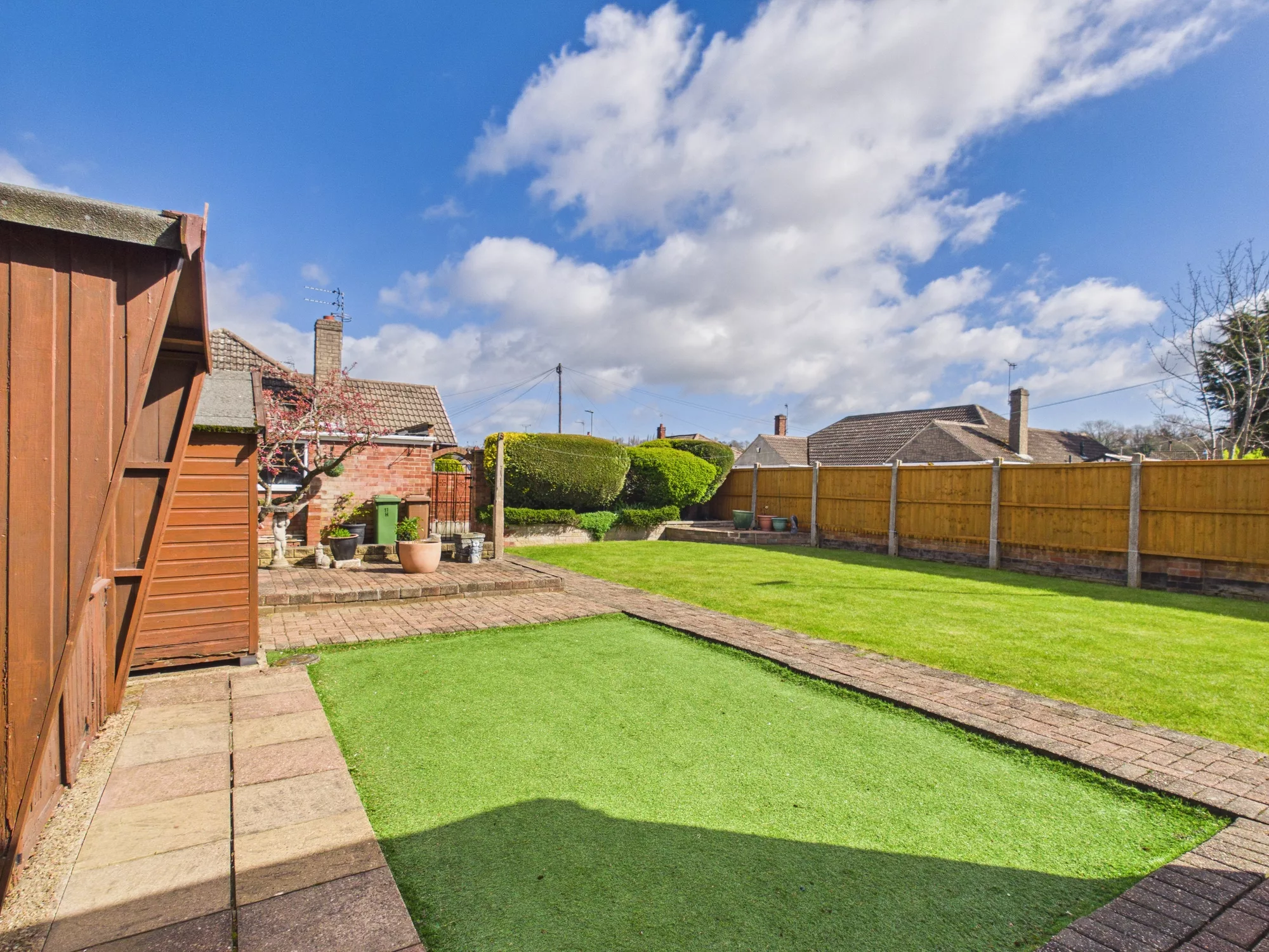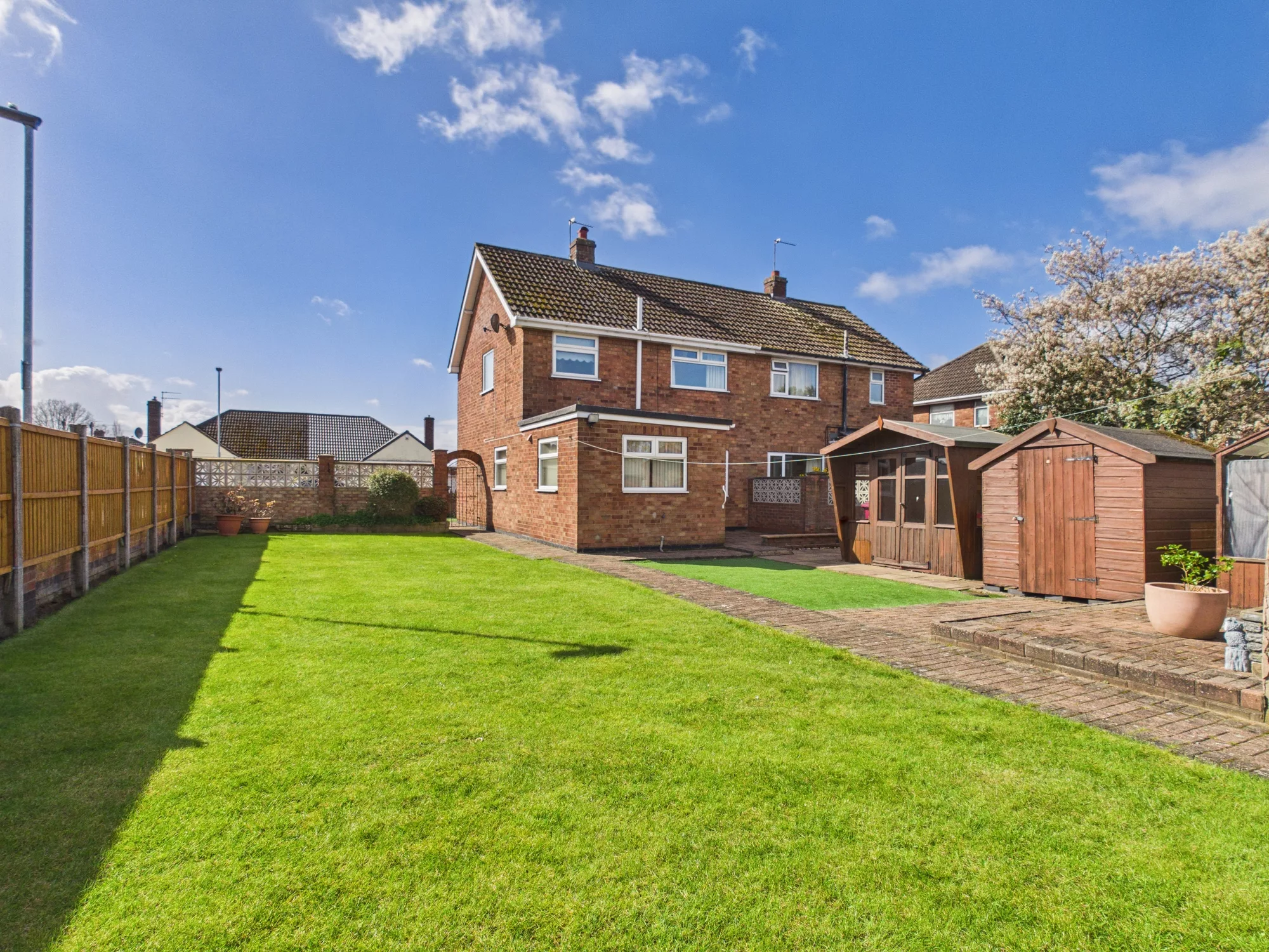 Outside, the rear garden is a true standout feature—exceptionally spacious, private, and thoughtfully designed for low maintenance. A mix of artificial and natural lawn is complemented by mature trees and shrubs, creating a peaceful retreat. There’s also a charming summer house and three sheds, offering excellent versatility and storage. A further gated access leads to the rear driveway and detached garage.