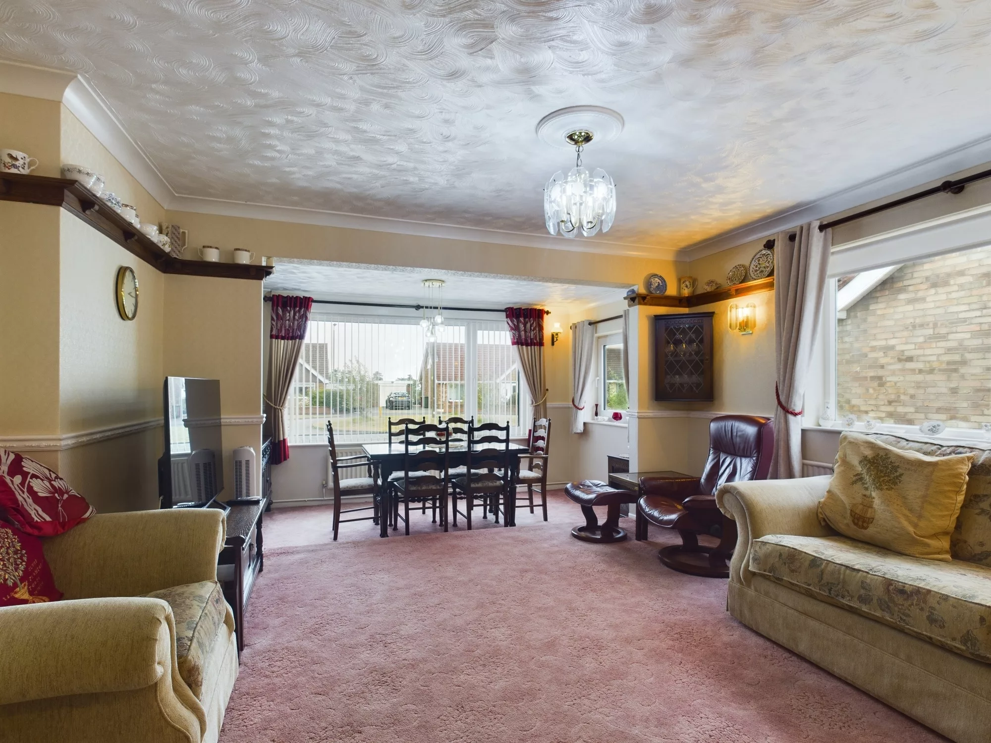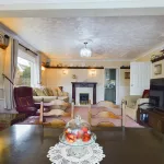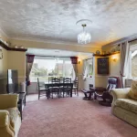 Upon entering the spacious split-level lounge and dining area, one is immediately struck by the charm and character of the room. Light pours in through UPVC double glazed windows to both the front and side elevations, enhancing the sense of space. A distinguished Adam-style fireplace with marble back and hearth serves as a graceful focal point, while ornate ceiling coving and ceiling roses add a touch of period elegance. The room is further enhanced by a central heating radiator, a traditional dado rail, and soft carpeted flooring, offering both comfort and timeless appeal.