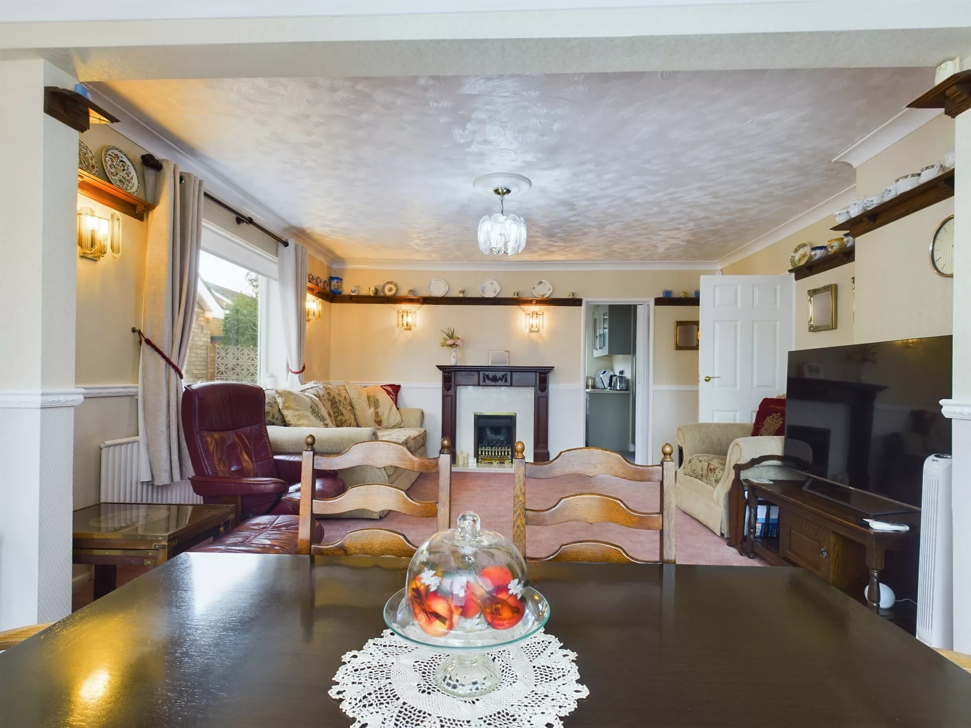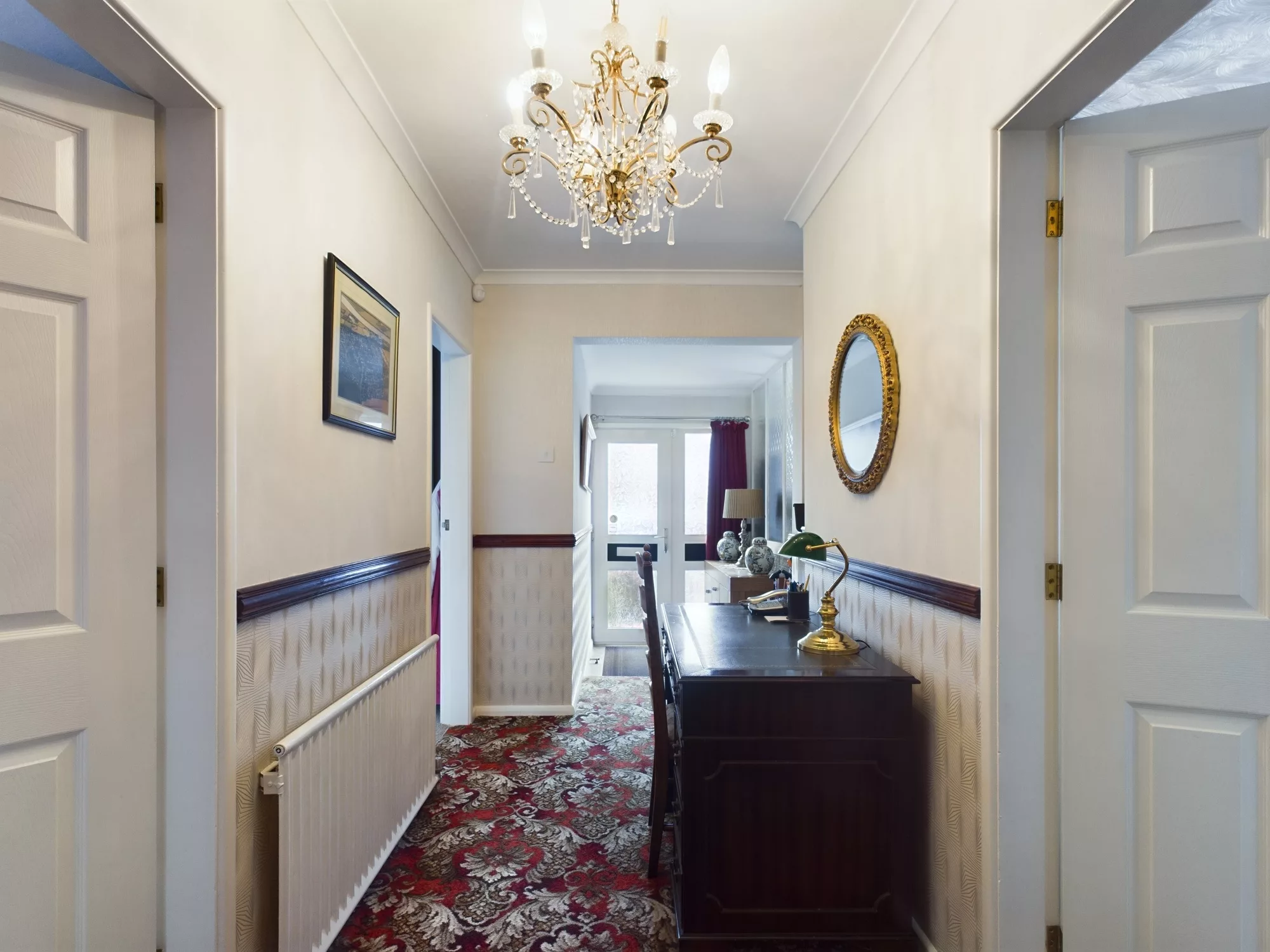 Enter the home through a stylish white UPVC double-glazed door into a welcoming entrance hallway. Tastefully finished with plush carpeting and a classic dado rail, the space exudes warmth and charm. Thoughtfully placed doors lead to the main living areas, while a central heating radiator ensures a cosy and comfortable welcome all year round.