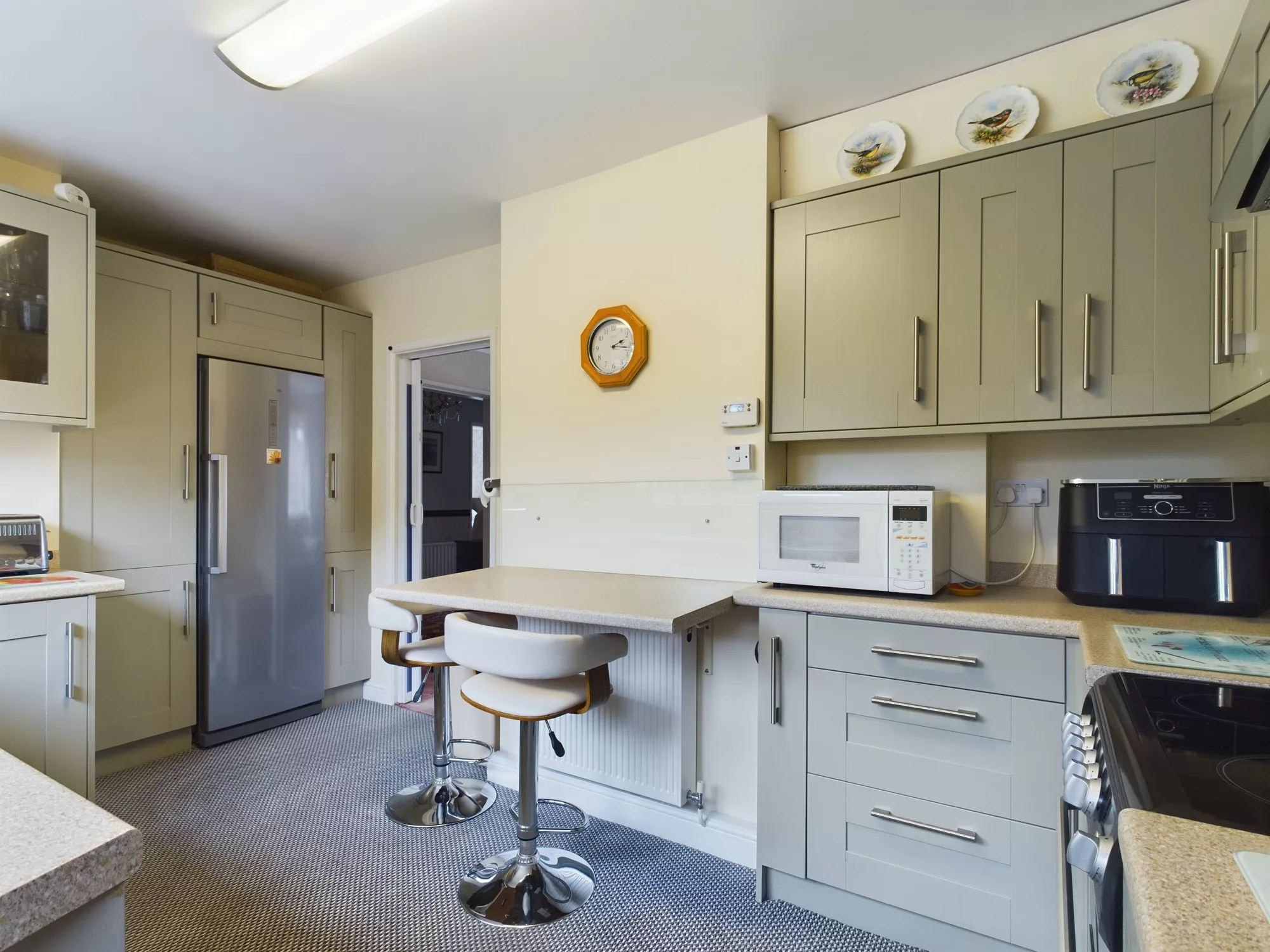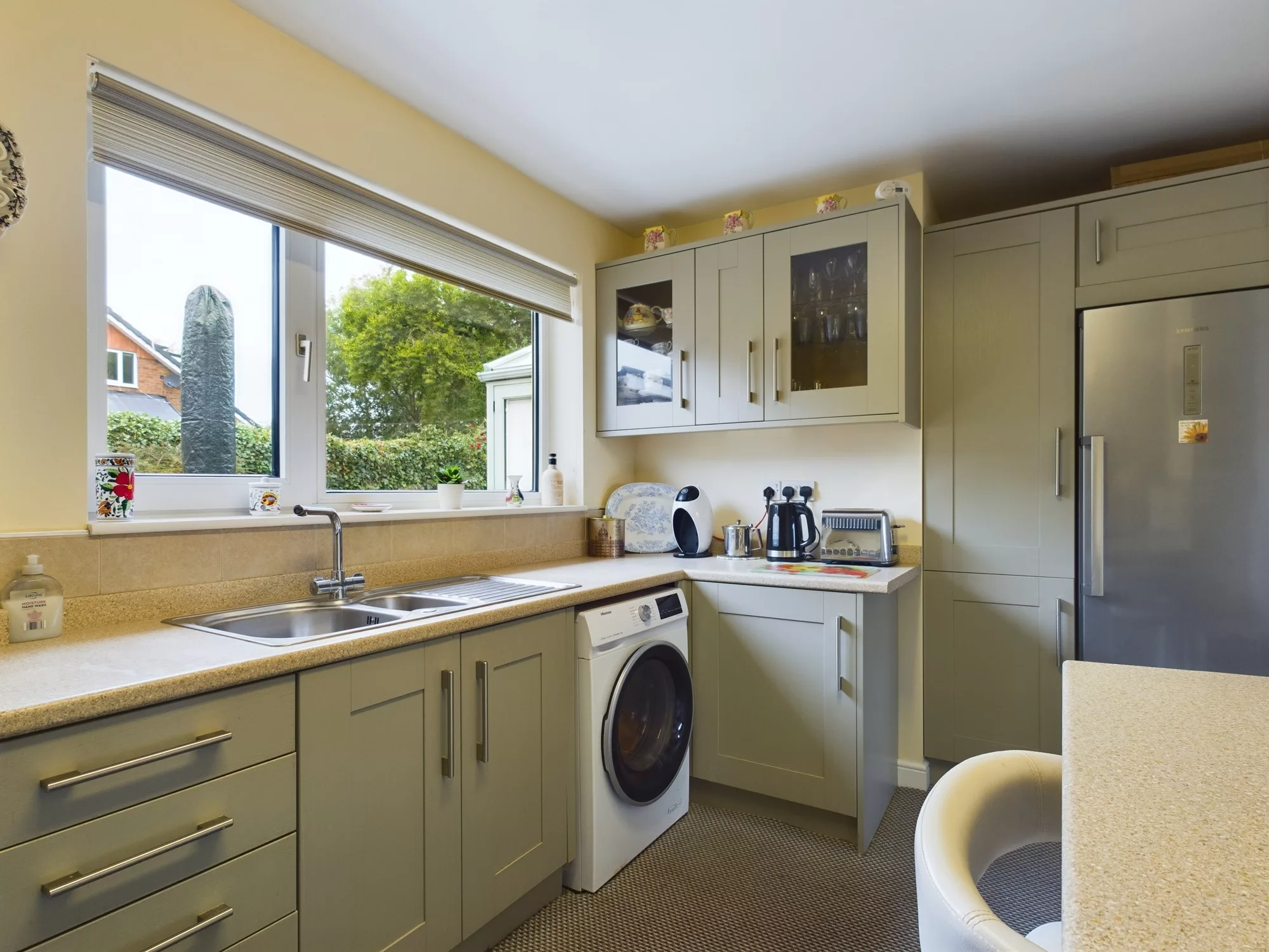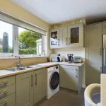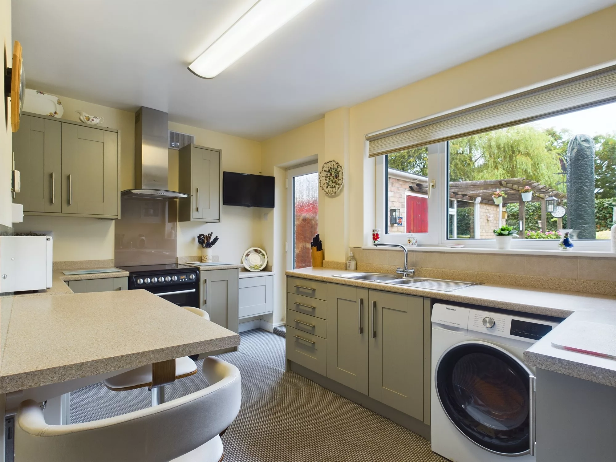 The kitchen is fitted with an attractive range of modern Shaker-style wall, base, drawer, and tall units, providing ample storage and a classic aesthetic. A stainless steel one and a half bowl sink with mixer tap is set beneath a UPVC double glazed window overlooking the rear elevation, with a matching door providing direct access to the garden. Additional features include a convenient breakfast bar, stainless steel chimney-style extractor hood, and designated spaces for a cooker, washing machine, and fridge. A central heating radiator completes the space, ensuring both practicality and comfort.