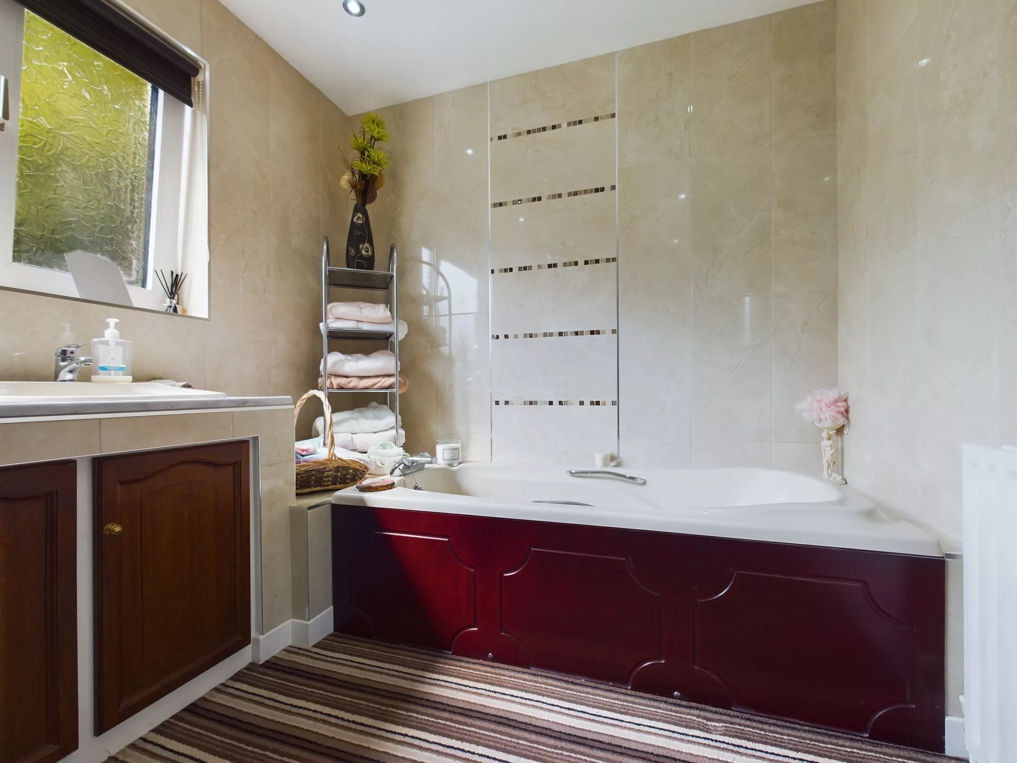 The en-suite is a well-appointed four-piece bathroom, thoughtfully designed for both style and functionality. It features his and hers sinks set within a bespoke vanity unit, a corner shower enclosure, a panelled bath, and a low level WC. An obscure UPVC double glazed window to the rear provides natural light while maintaining privacy. The space is further enhanced by a heated towel rail radiator and fully tiled walls, offering a polished and luxurious finish.
