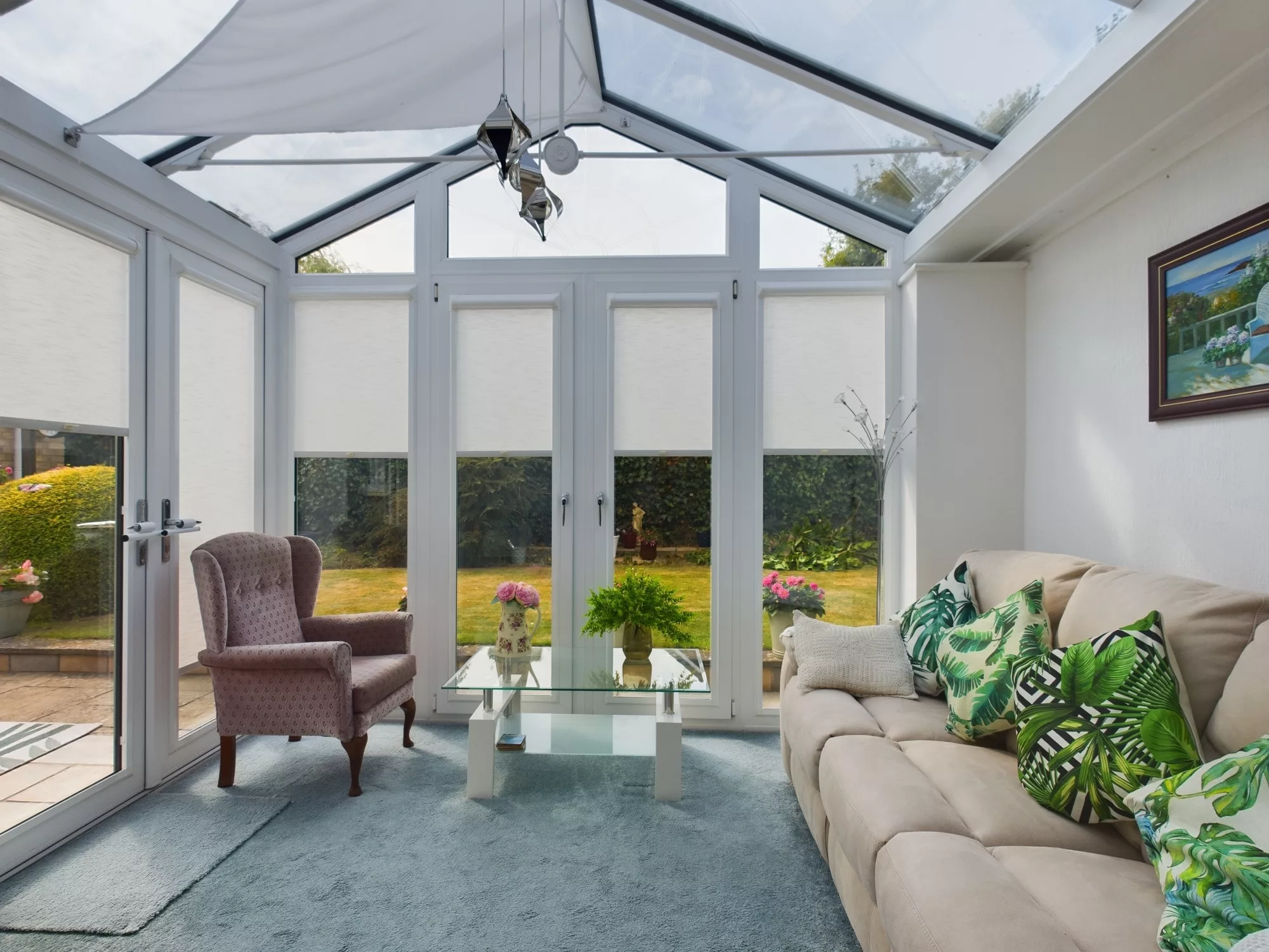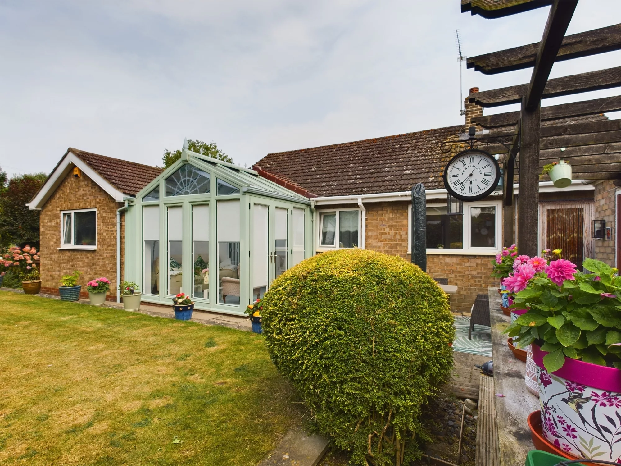 The striking conservatory is beautifully crafted with UPVC double glazing and externally finished in an elegant sage green, complementing the surrounding garden. Featuring a clear apex roof that allows for an abundance of natural light, the space is enhanced by two sets of French doors offering seamless access to the rear garden. The conservatory also benefits from power and lighting, making it a versatile room to enjoy throughout the year.