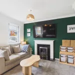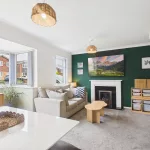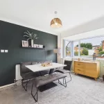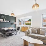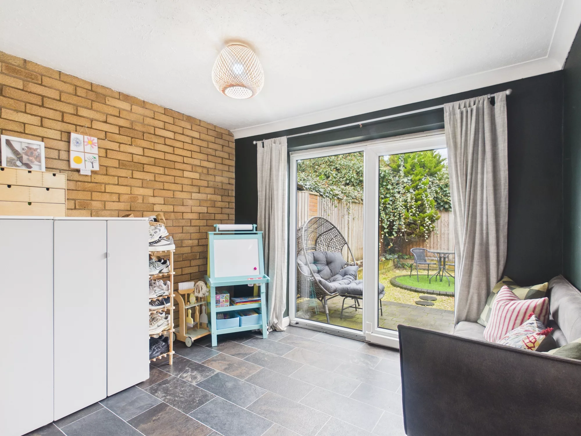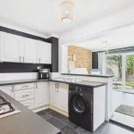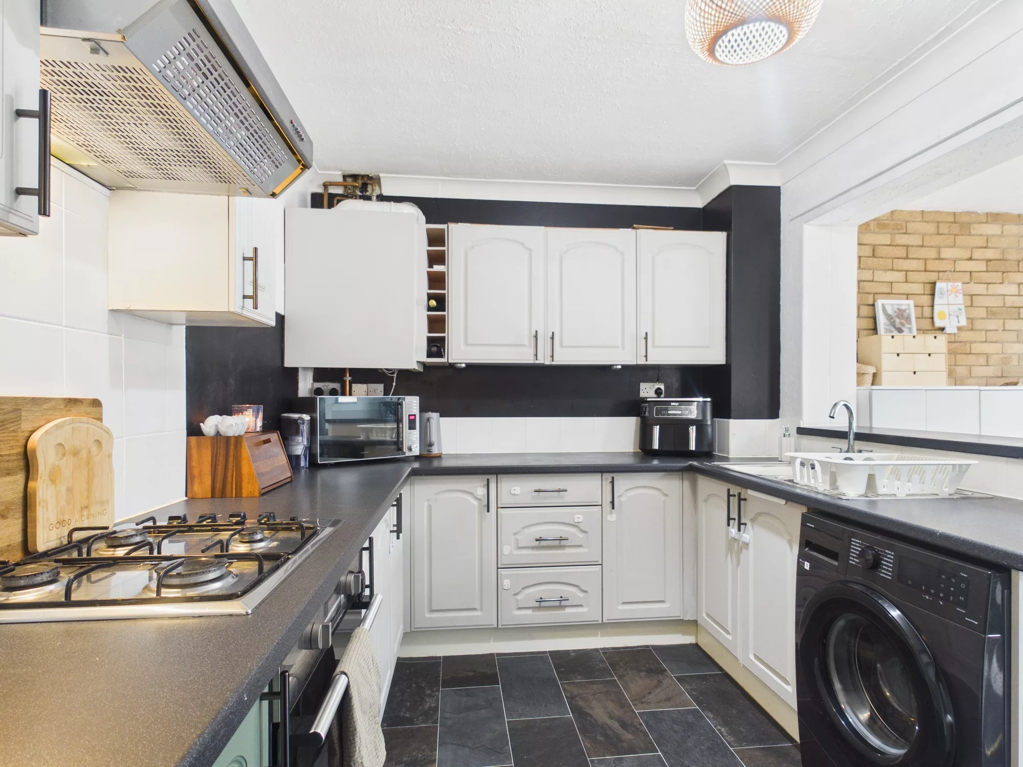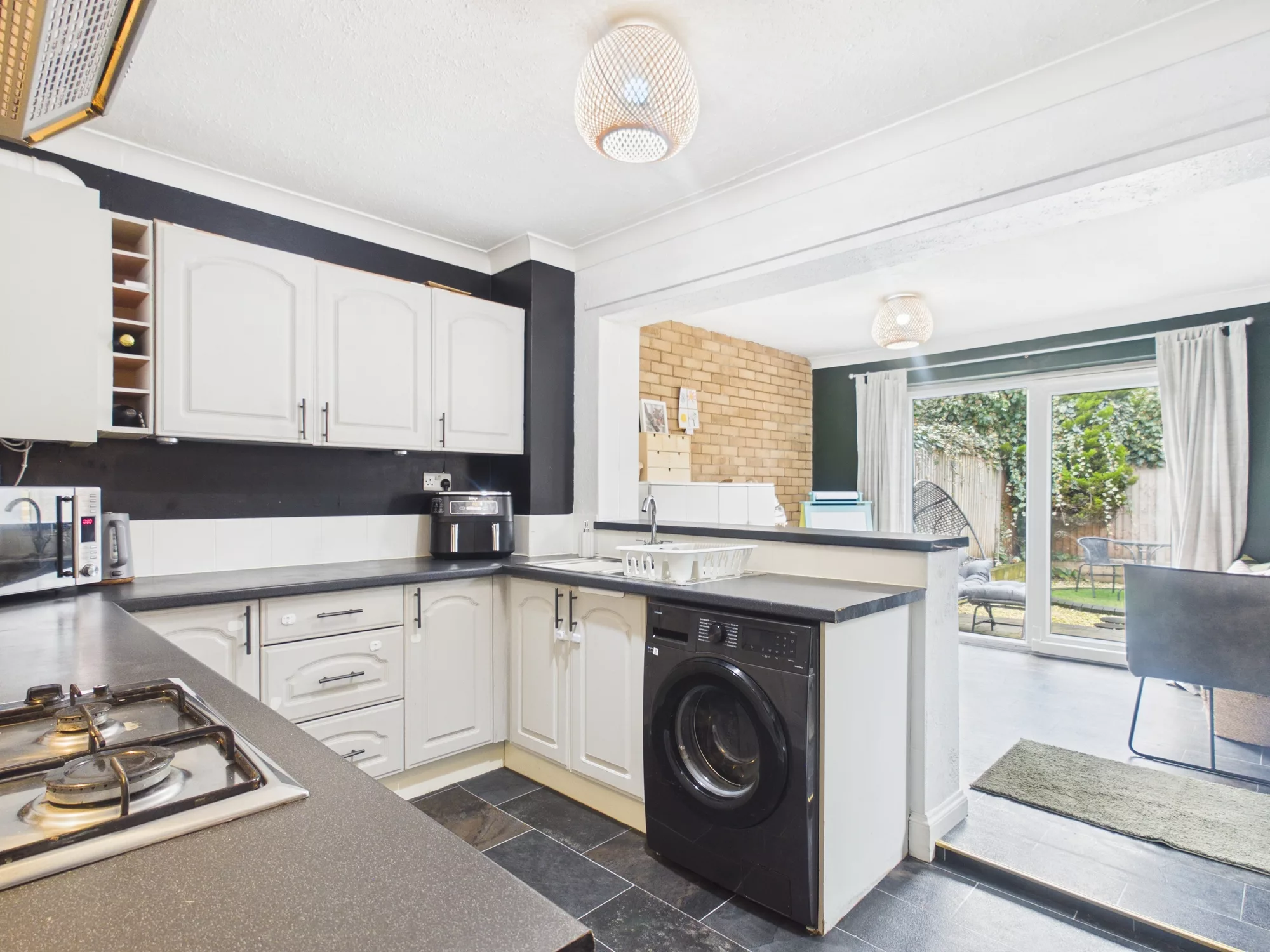 To the rear of the property is a bright and thoughtfully designed kitchen diner. The open-plan layout offers the best of both worlds — sociable and connected, yet still feeling like two distinct spaces. The kitchen is fitted with an integrated oven, gas hob and extractor hood, with undercounter space for a washing machine and room for a freestanding fridge/freezer. A useful storage cupboard adds further practicality. The dining area is light and airy, with sliding patio doors opening directly onto the rear garden, creating an effortless flow between indoor and outdoor living. A convenient downstairs W.C. completes the ground floor.