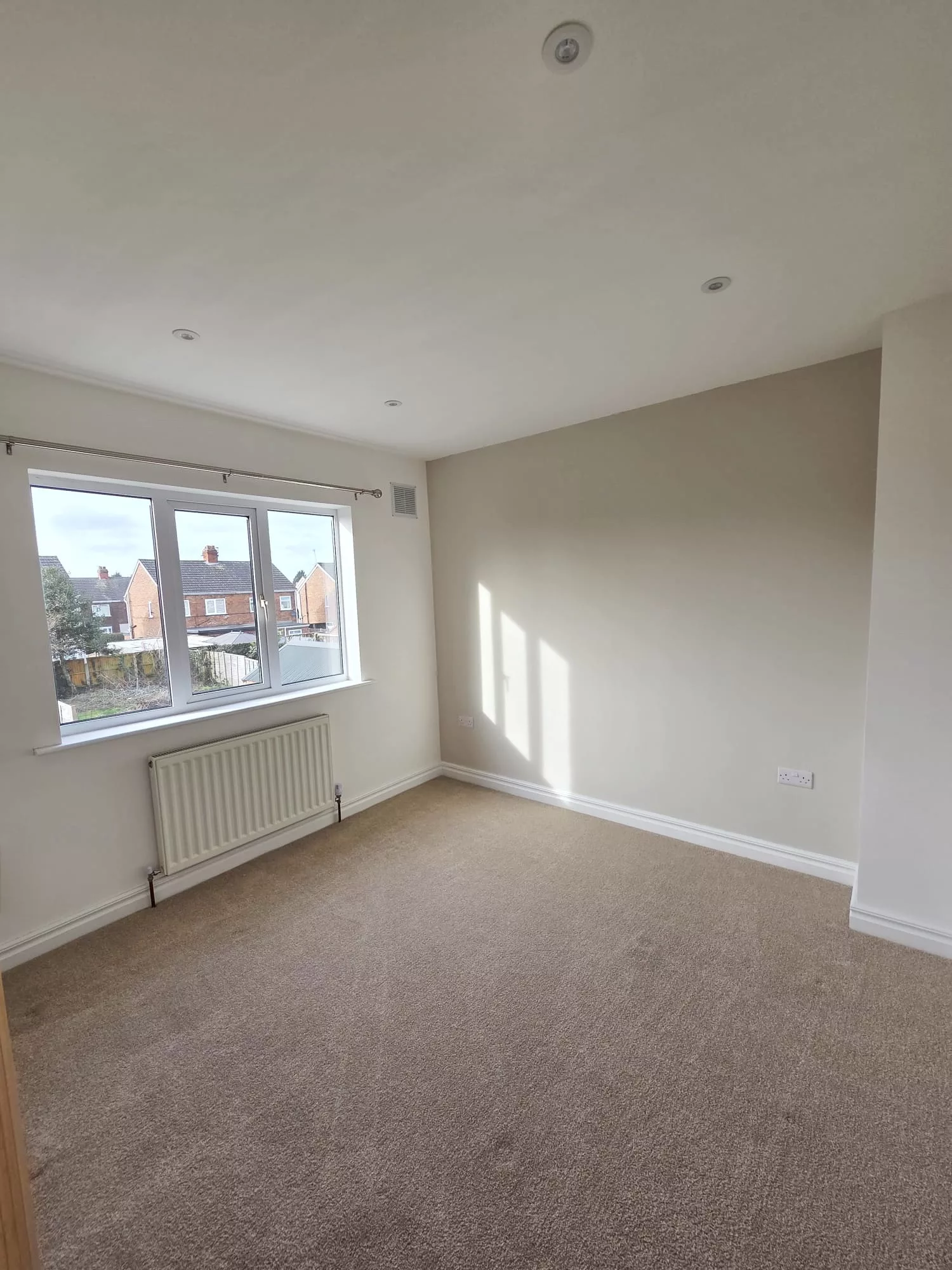 To the rear, you’ll find a superb newly fitted kitchen/diner designed for modern living. Complete with an integrated oven, electric hob and extractor fan, there’s ample under-counter storage plus generous space for freestanding dining furniture and additional appliances. A walk-in storage cupboard adds practicality, while a side door provides direct access to the rear garden — ideal for entertaining.