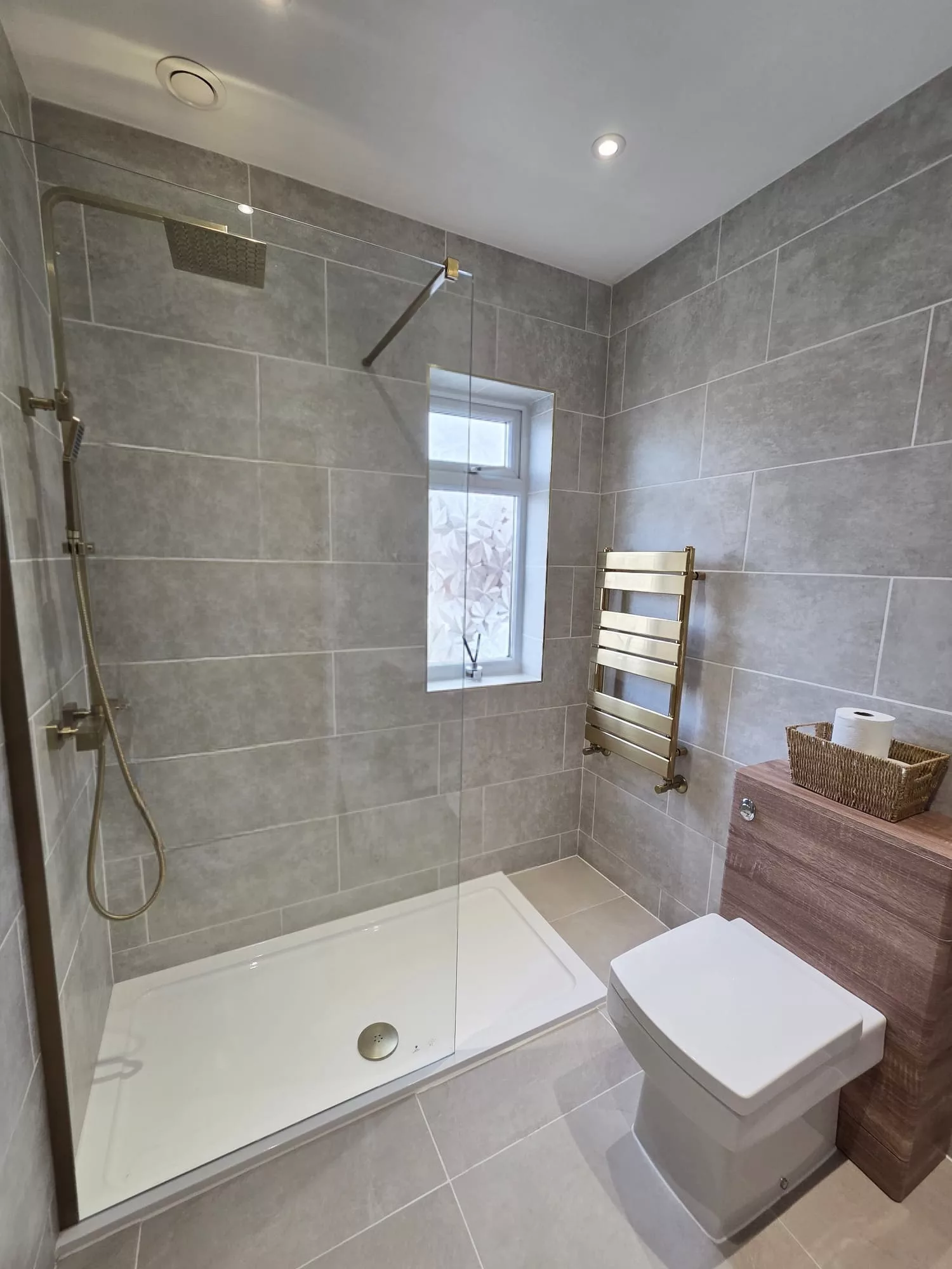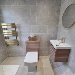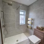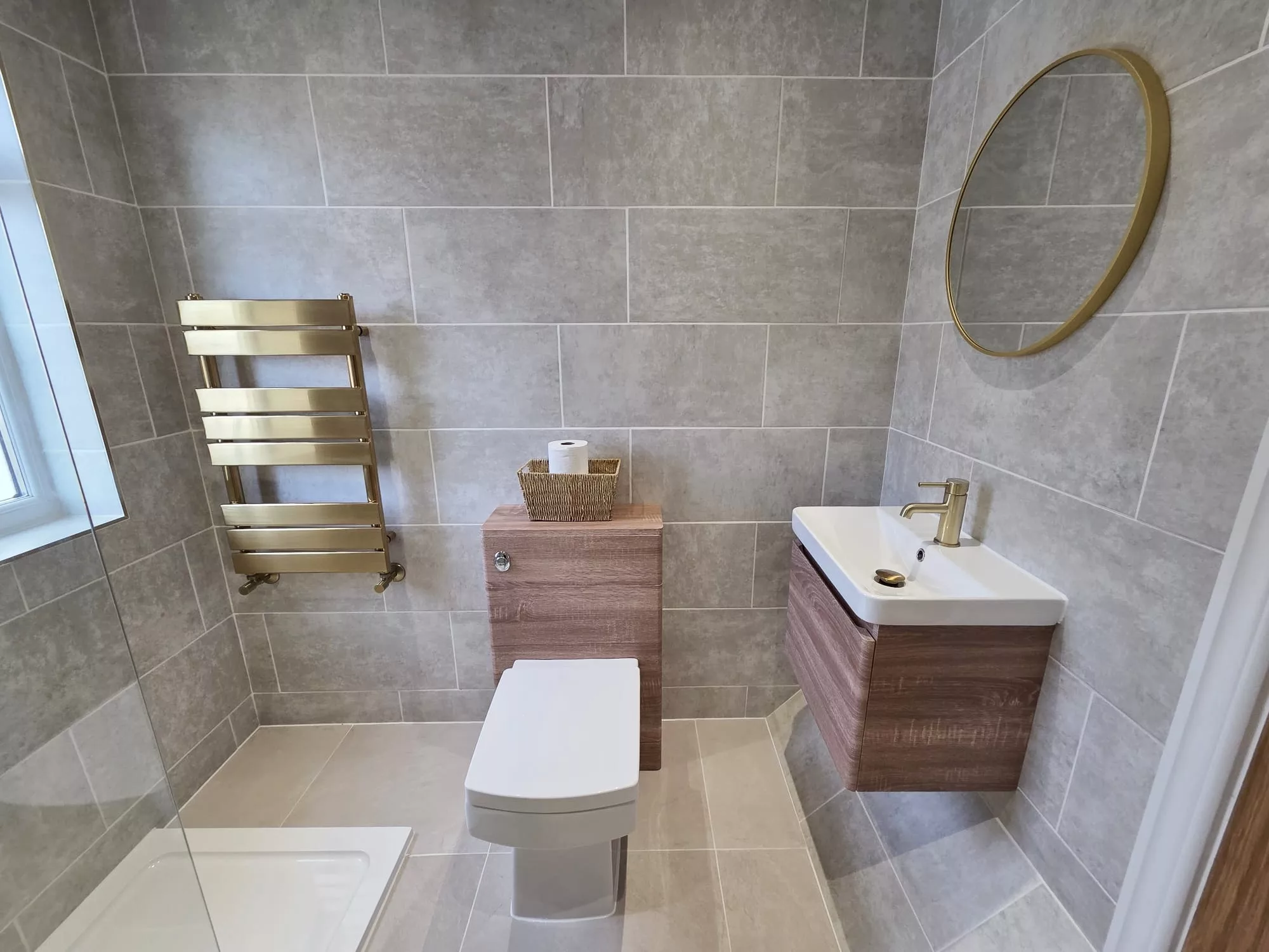 Upstairs, the landing leads to three well-proportioned bedrooms, two of which are spacious doubles. The brand-new shower room is sleek and contemporary, featuring a generous walk-in shower, floating vanity sink with matching WC, and a statement gold heated towel radiator — a luxurious finishing touch.