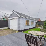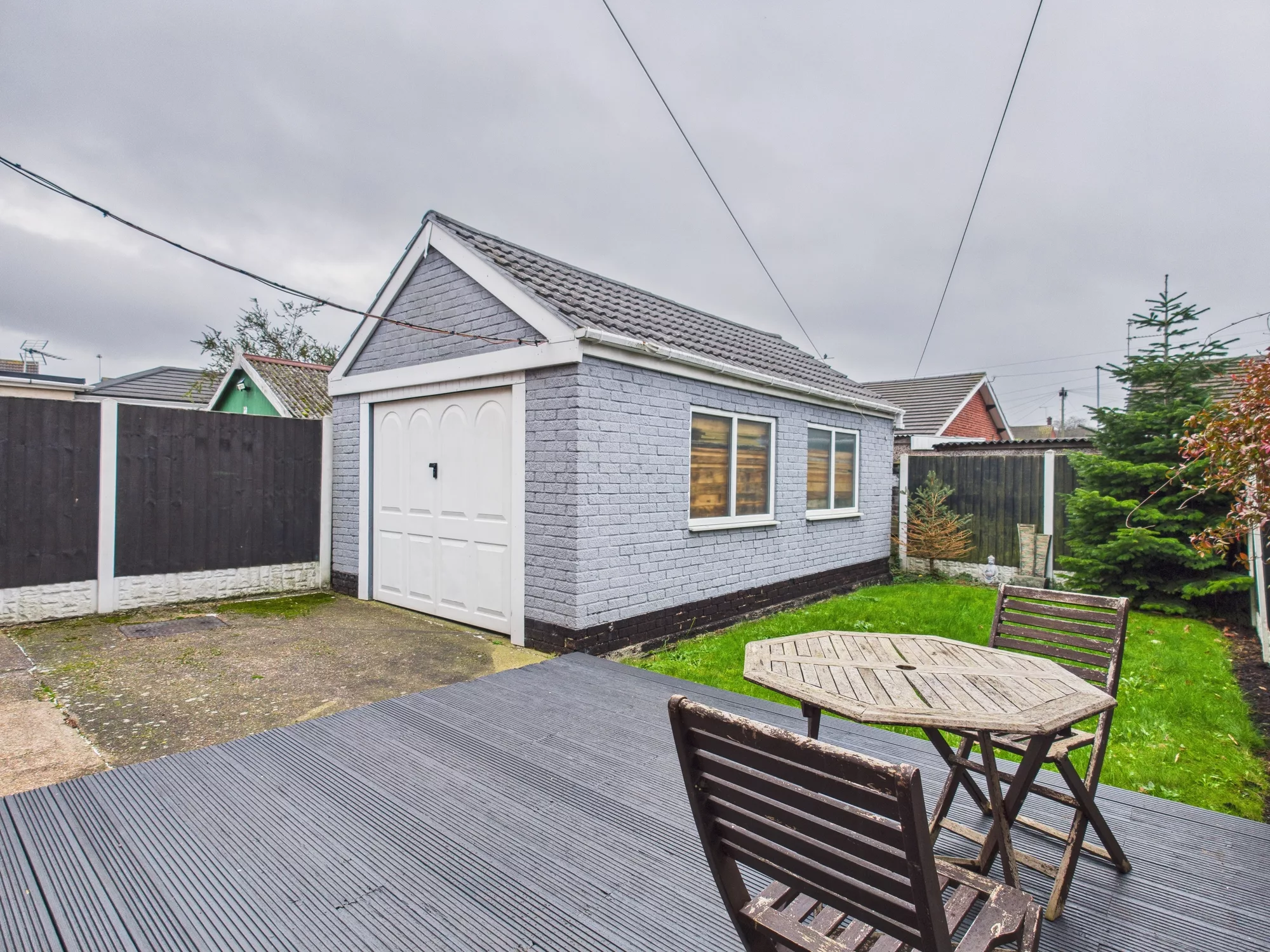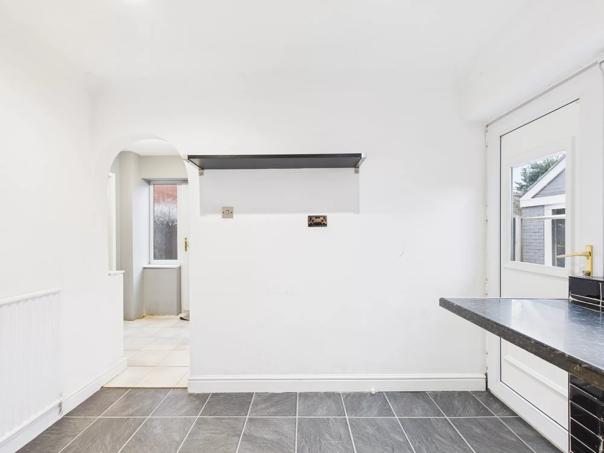 Step inside via the welcoming entrance hall, leading through an open archway into the well-equipped kitchen, complete with an integrated oven, electric hob and extractor hood. There’s practical under-counter space for a washing machine, room for a freestanding fridge/freezer, and two built-in cupboards providing excellent storage. A uPVC double glazed rear door opens directly onto the decking—perfect for indoor-outdoor living.