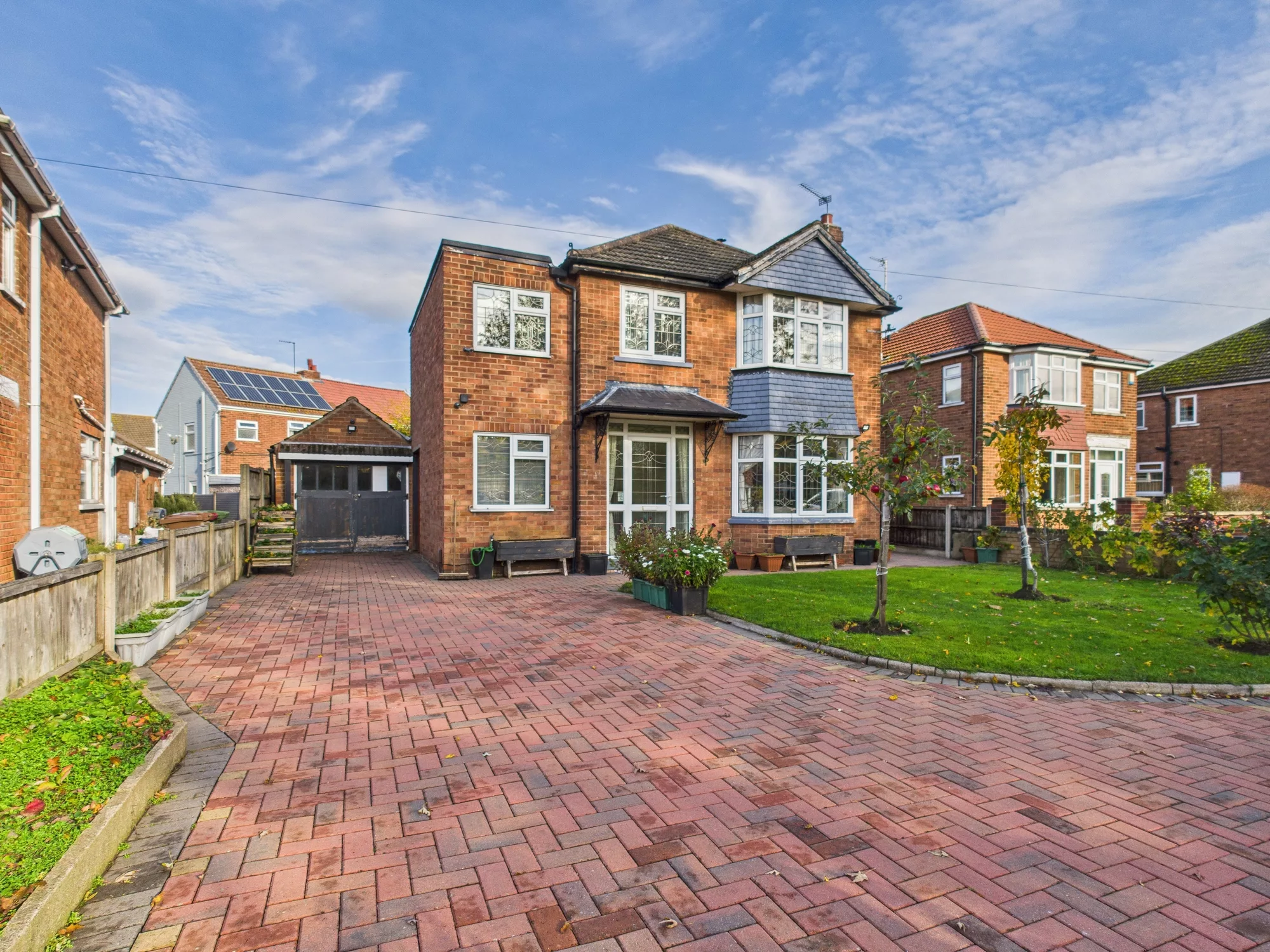 Upstairs offers four well-proportioned bedrooms and a family bathroom, ideal for growing families. Outside, the property features an expansive block-paved driveway, neat lawn frontage, and a private, low-maintenance rear garden complete with outdoor toilet, BBQ area with wood storage, and sink — perfect for entertaining.